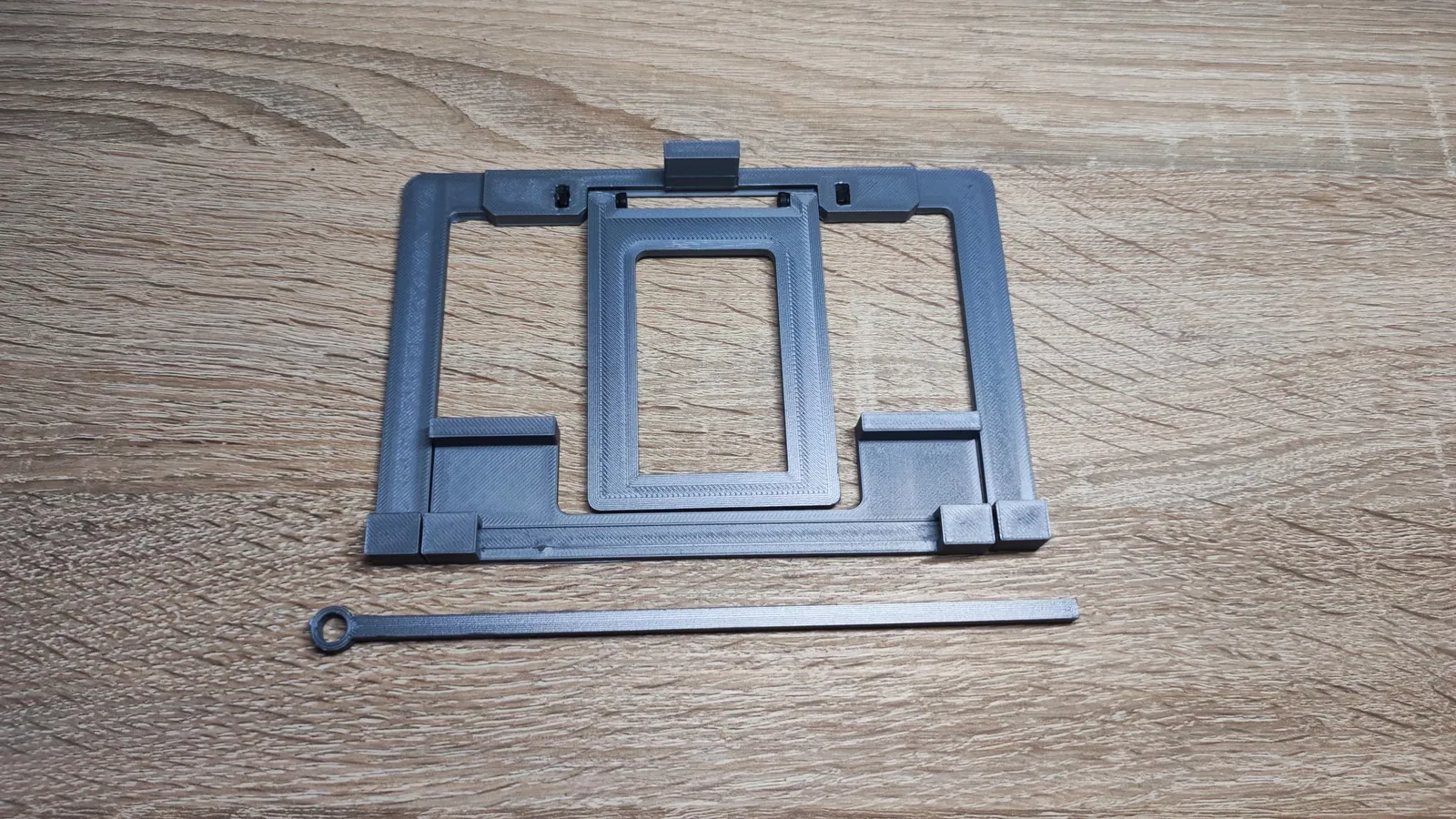 Tui thiết kế một cái "chốt" đơn giản (thanh hình chữ nhật) để khóa phần đỡ máy tính bảng, chỗ máy dựa vào đó.