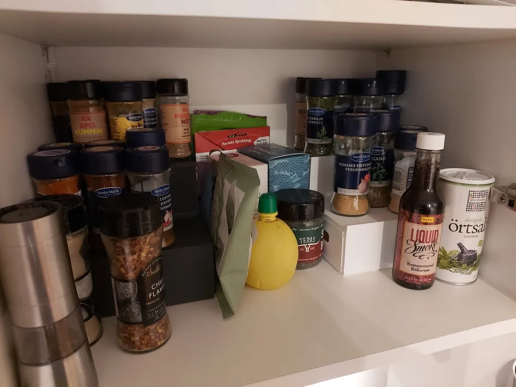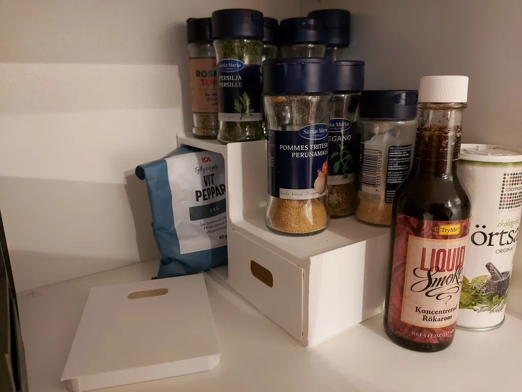 Giúp mấy chai gia vị ở sâu trong tủ bếp của bạn dễ lấy hơn. Tùy chỉnh chiều rộng theo ý thích. Có thể in thêm ngăn kéo hoặc nắp che để tận dụng tối đa không gian.