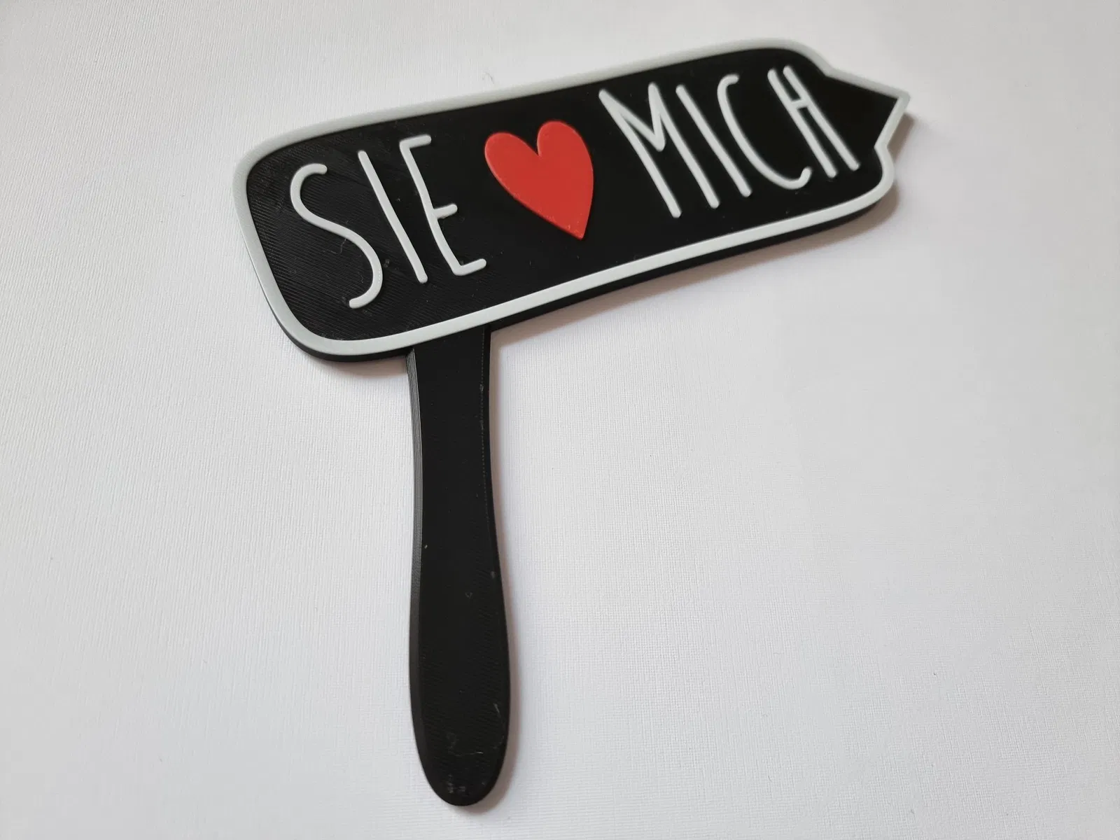 Bộ phụ kiện chụp ảnh đa sắc màu / biển hiệu "Sie liebt mich". Thoải mái chụp hình với các biển hiệu bền bỉ, thân thiện môi trường, thay vì dùng đồ giấy mau hư. Phù hợp cho máy in 3D có hệ thống đổi màu tự động.