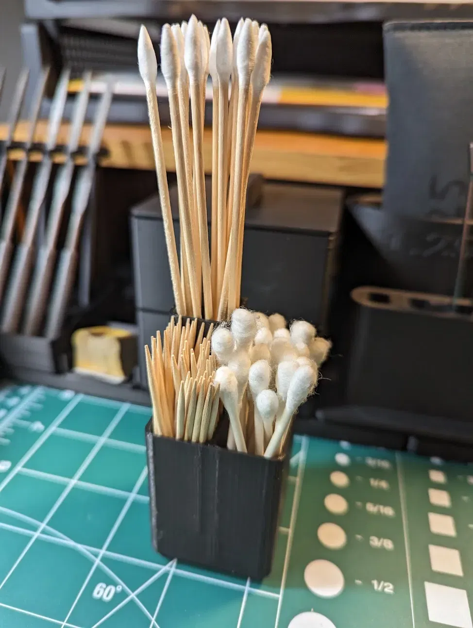 Kệ Gridfinity 3 ngăn, mình có kèm theo một kệ có đáy phẳng, và một kệ có một ngăn với sàn nâng lên để giữ tăm ở độ cao tương đương với tăm bông thông thường như trong ảnh bìa.