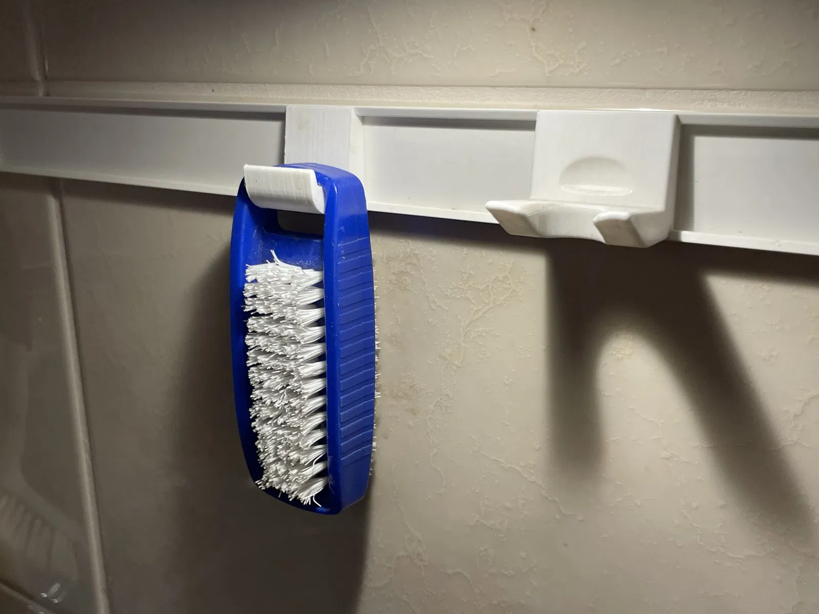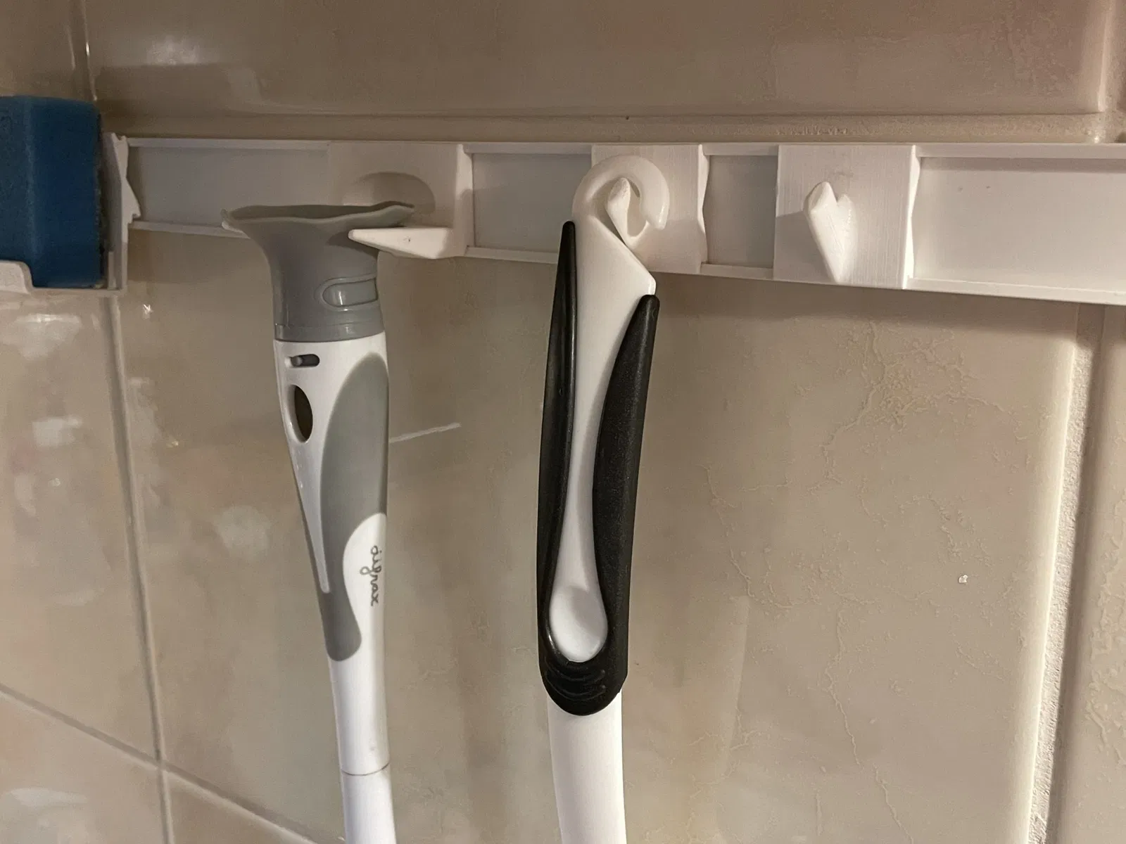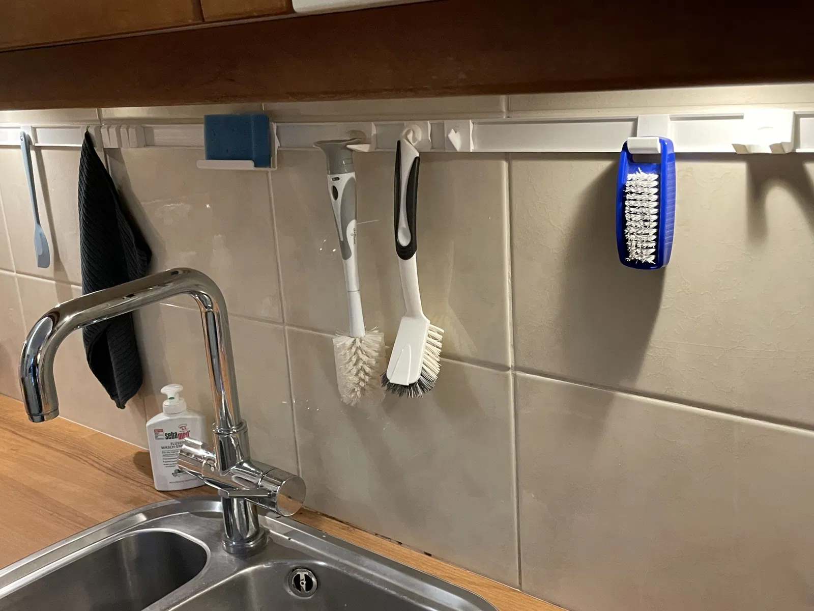 Use a cable tray - cover of 30mm widht and patch/glue it to the kitchen tiles. This creates a rail for different hooks to be snapped in. Configure to your own desire and slide to rearrange positions or remove unused items.