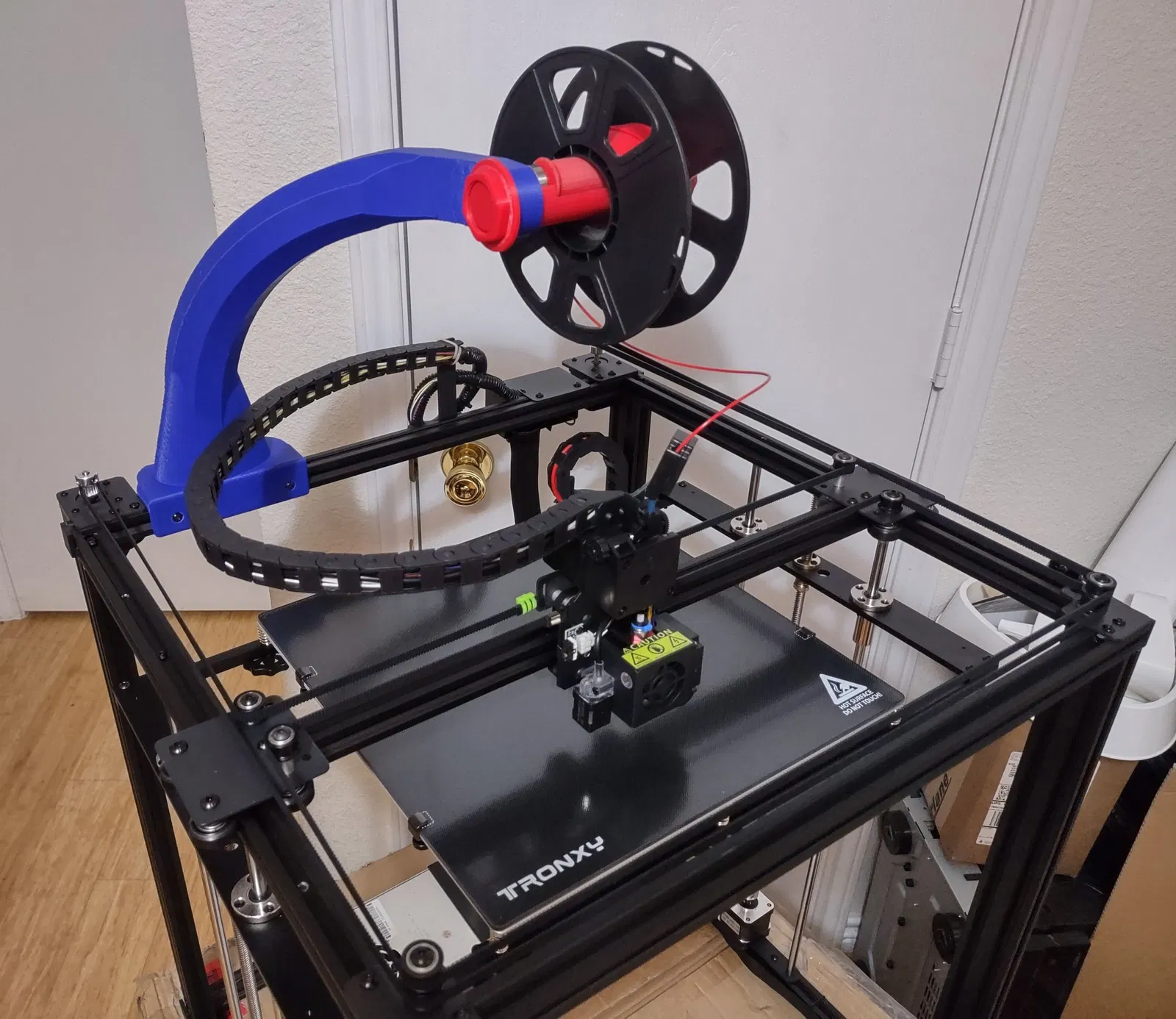 Tự làm giá đỡ cuộn dây tóc phía trên máy in Tronxy X5SA với đầu đùn trực tiếp, giúp tránh ma sát và rối dây từ ống Bowden. Thiết kế này được tùy chỉnh sau nhiều lần thử nghiệm, chắc chắn và lớn hơn.