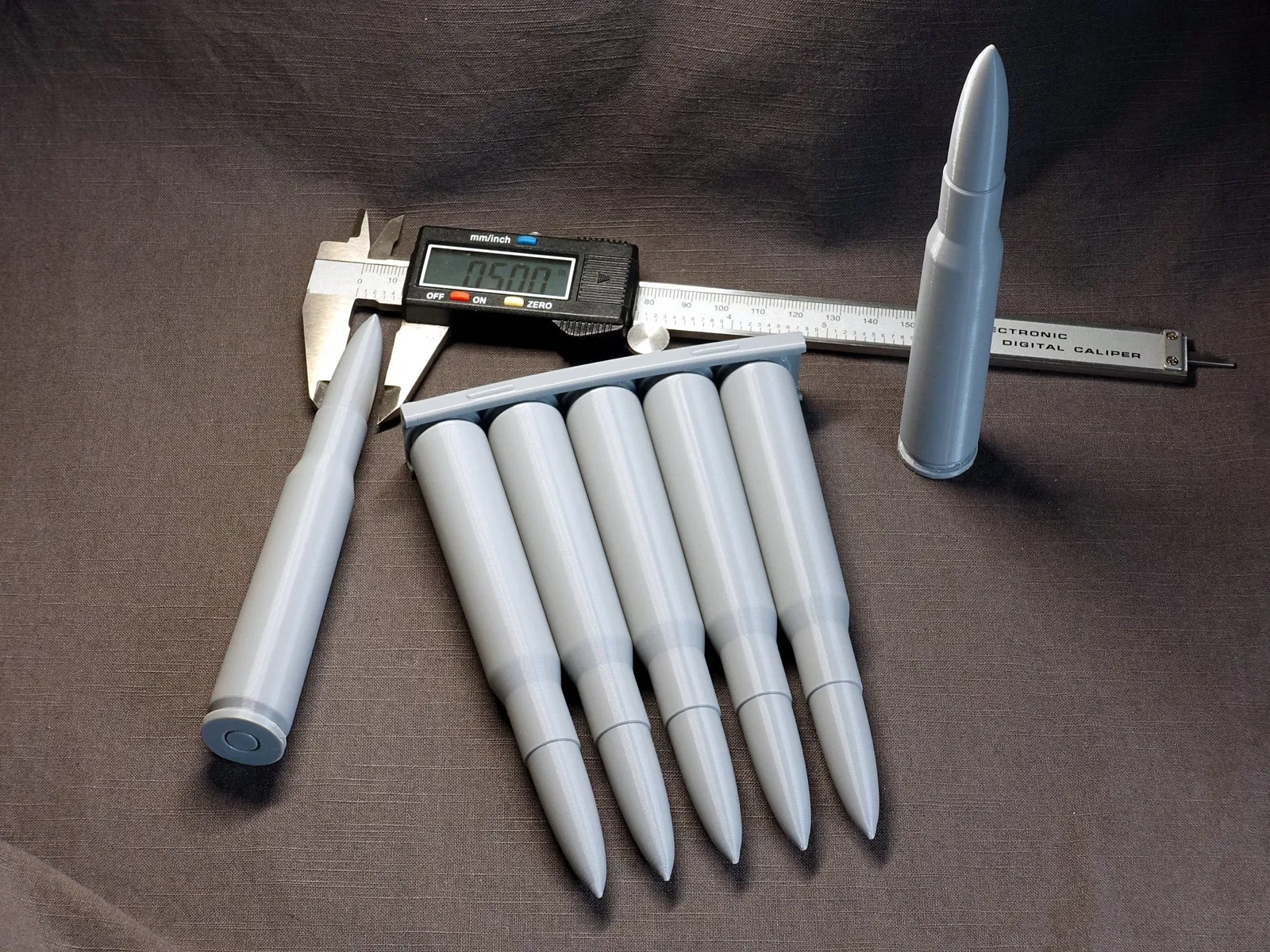 Mô hình một viên đạn cỡ 50 inch (biết đến với tên gọi 50 BMG hoặc 12.7×99mm NATO). Cái kẹp đạn này là đồ tưởng tượng, chỉ dùng để trưng bày thôi, nó có thể chứa 5 viên đạn. Loại đạn này được dùng trong súng máy hạng nặng M2 Browning và súng bắn tỉa chống vật liệu M82 Barrett.