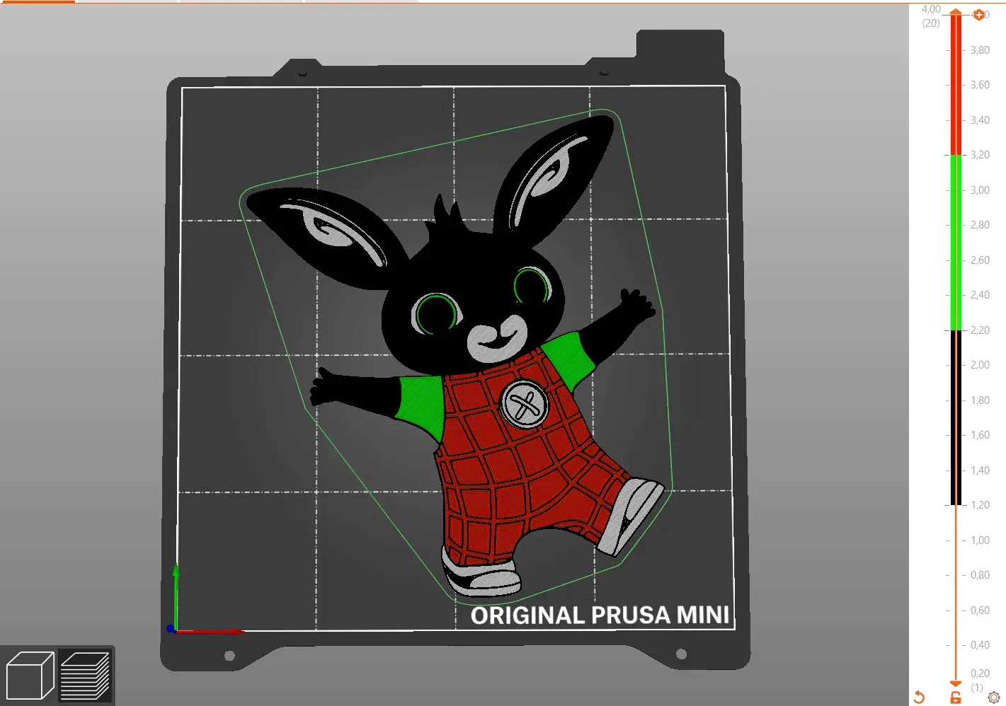 Mô hình thỏ Bing trong định dạng 2D. Được thiết kế để in với bốn màu - mỗi màu có độ dày 1mm và filament thay đổi theo thứ tự trắng - đen - xanh lá - đỏ. Có thể in trên máy in Průša MINI với đầu phun 0,4mm và chiều cao lớp 0,2mm.