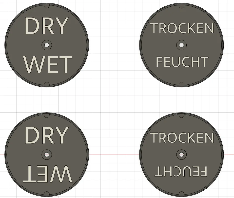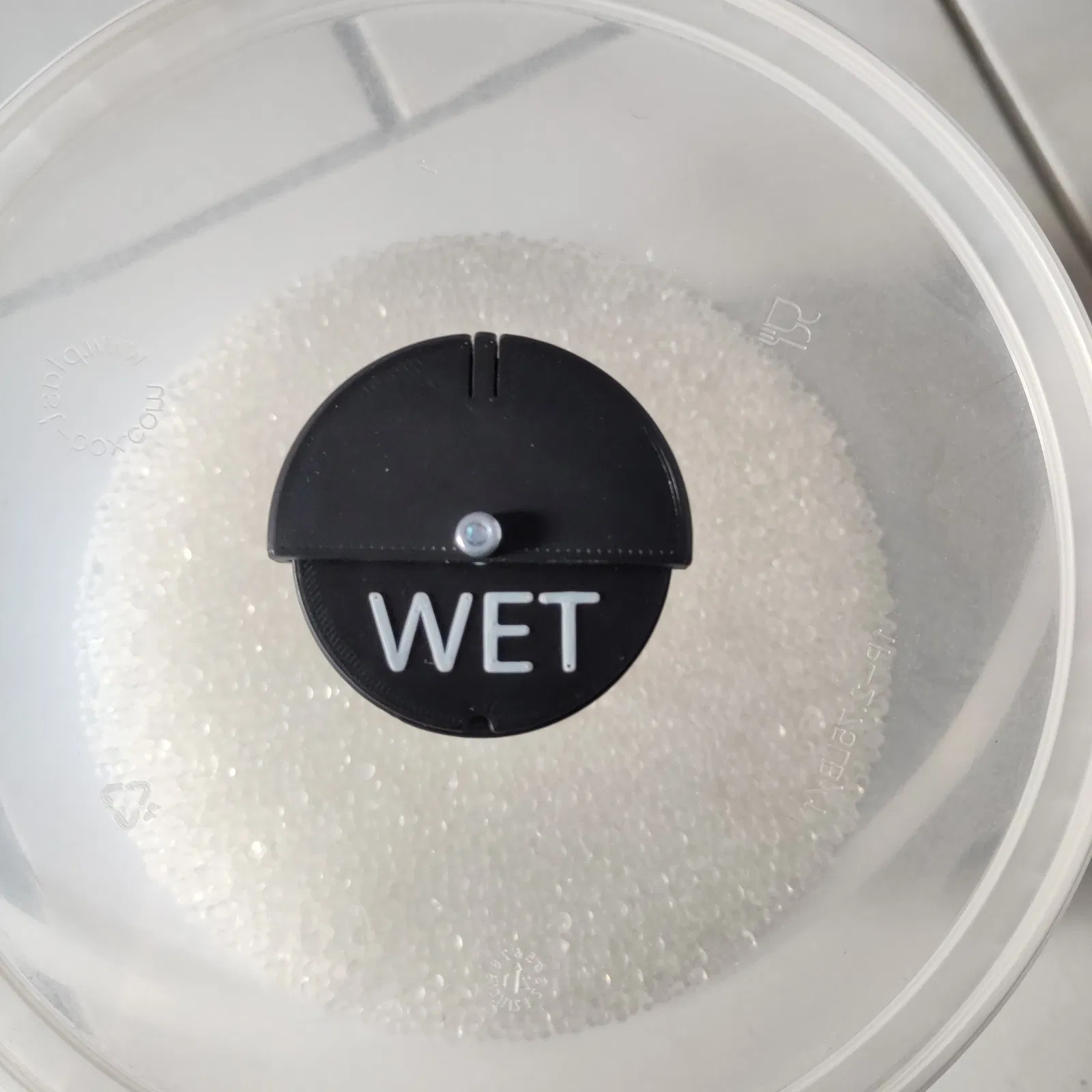 Bảng hiệu/nhãn "Ướt / Khô" (Wet / Dry) dùng để đánh dấu chất hút ẩm silica. Có cả phiên bản tiếng Đức "Trocken / Feucht". Thiết kế xoay được, có thể in thẳng hoặc lật, phù hợp dán nhiều vị trí. Sử dụng vít M3 để kết nối hai phần in.