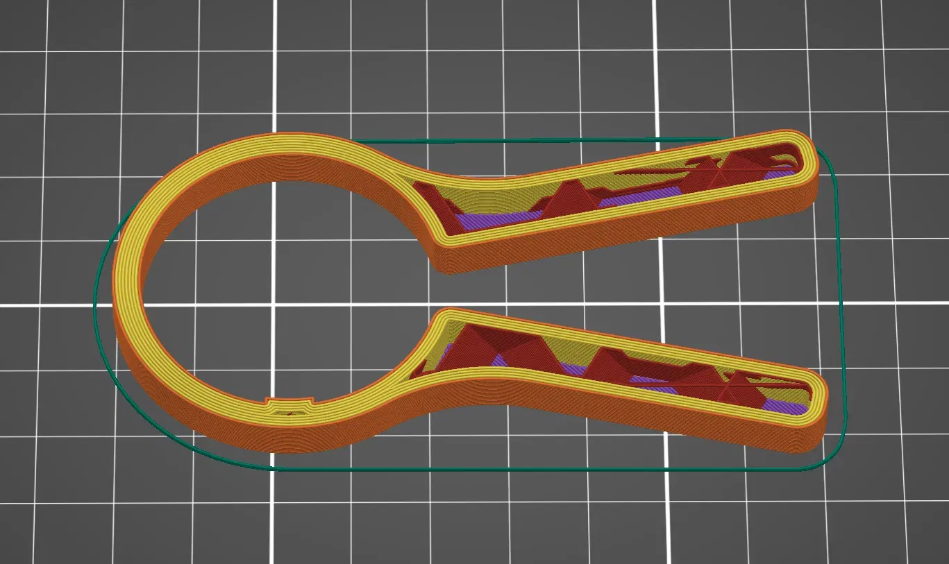 Khuyến nghị dùng 5 lớp biên để vòng kẹp được chắc chắn nhất có thể, đồng thời giữ được hình dạng tiết diện thấp. Tôi đã in bằng PETG để có khả năng kháng dung môi tốt hơn.