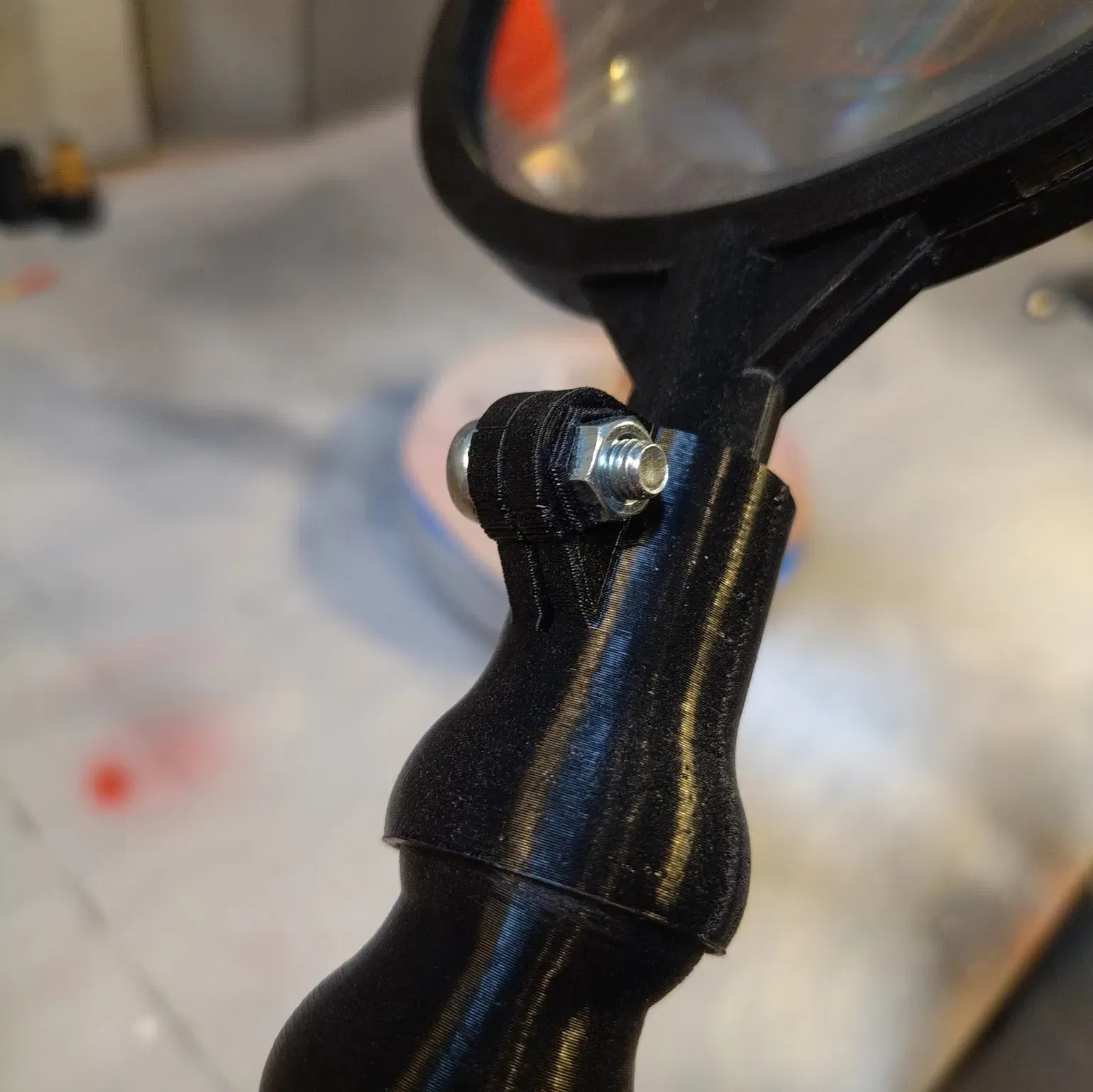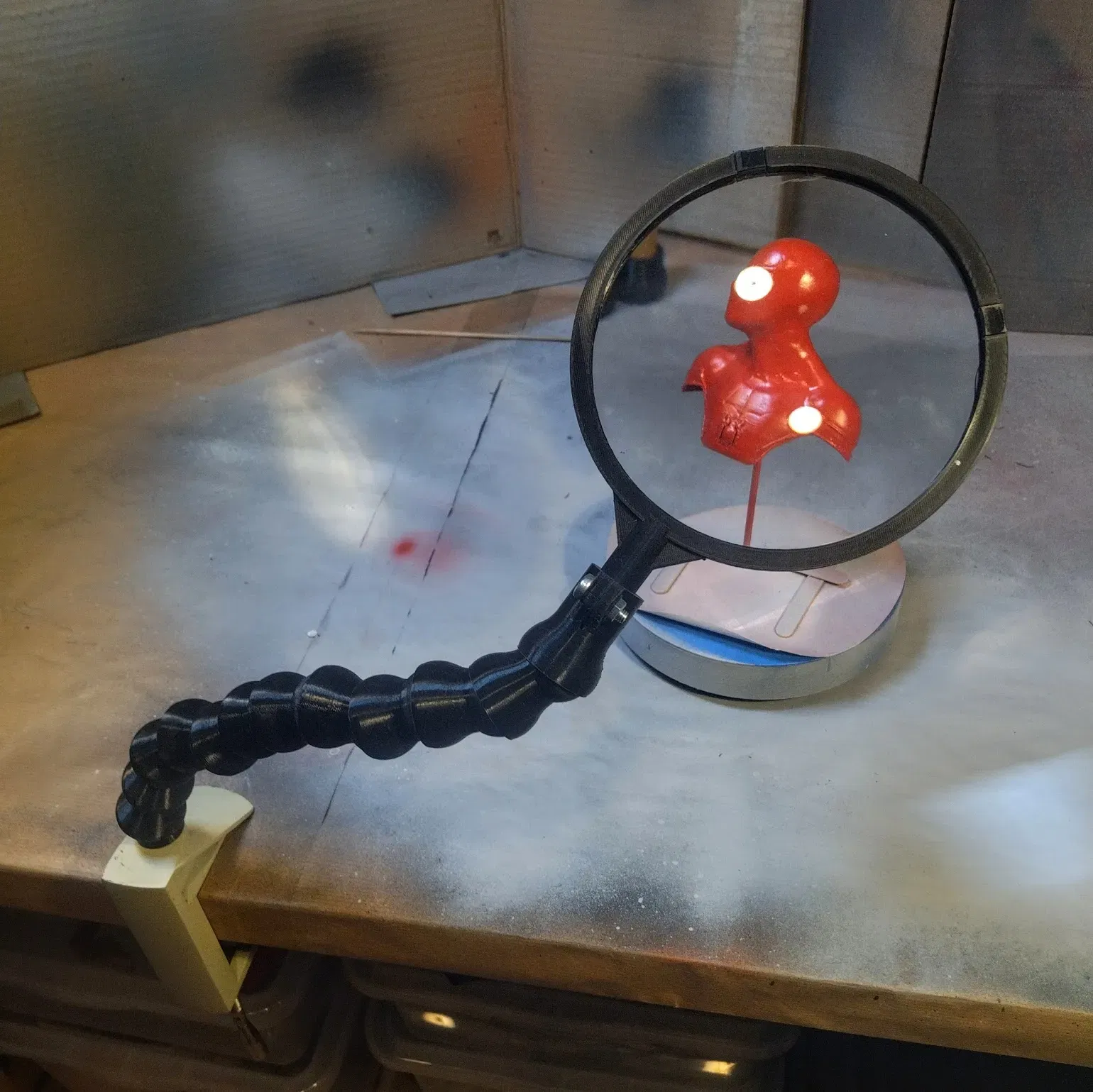 Vì vậy, tôi tìm thấy một đoạn Loc-Line trên Thingiverse, và một cái kẹp bàn cũ từ đèn kiến trúc, rồi mày mò làm ra cái tay dẻo này. Cái kính lúp bằng acrylic nên khá nhẹ, tay này không gặp khó khăn gì khi giữ nó, ít nhất là với độ dài 11 đoạn nối + đầu nối cuối mà tôi đang dùng. Nếu bạn có kính lúp kích thước khác thì việc chỉnh sửa khung cũng khá đơn giản. Cập nhật: Nếu kính của bạn nặng hơn, tôi khuyên bạn nên thêm dây thép 5mm làm xương sống.