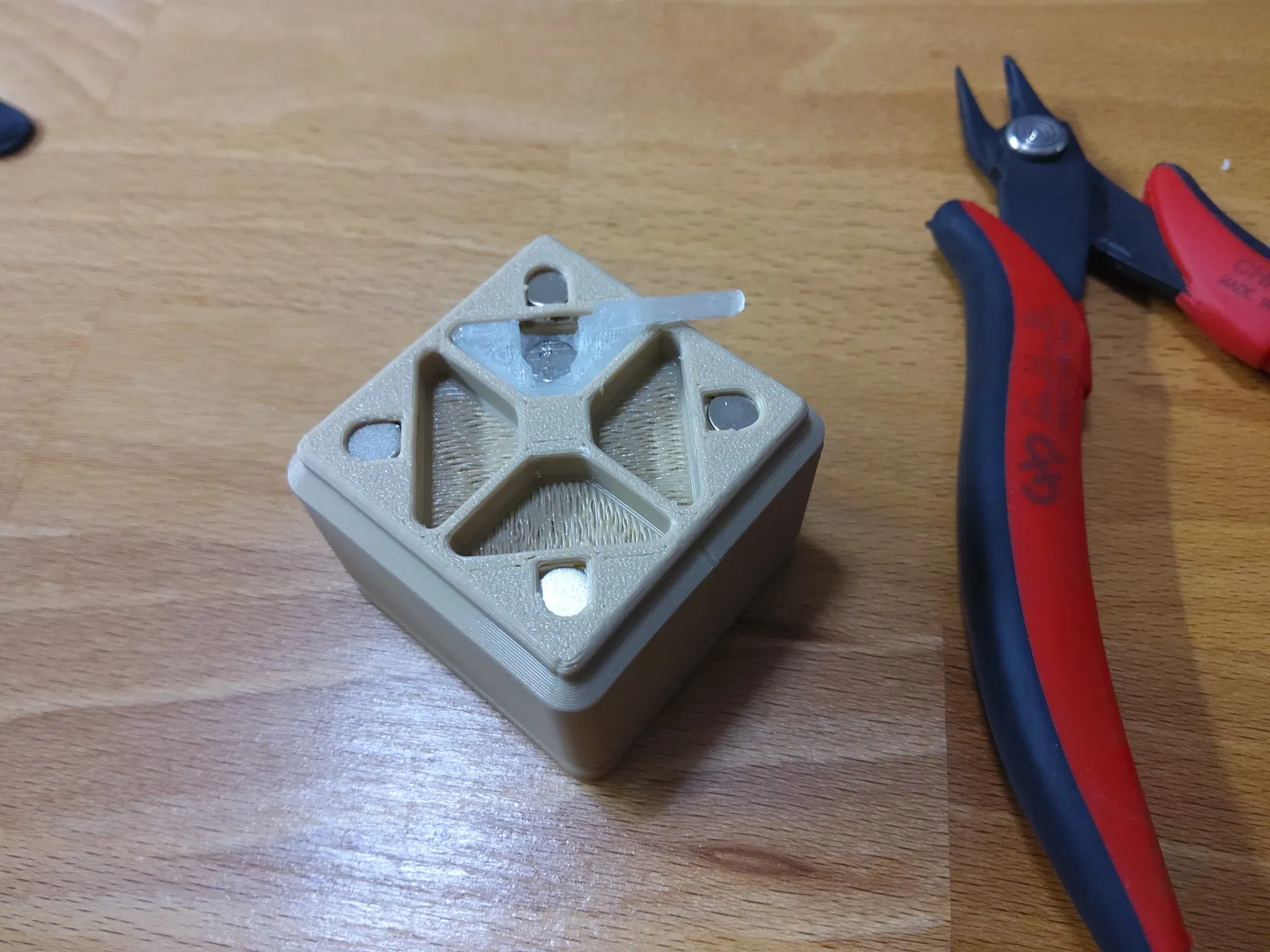 Cũng không phải là cái đồ xịn sò gì đâu. Phải mài nhẹ một chút để ép vừa cái khe lớn ở đáy hộp. Với lại, ban đầu định có một chút vật liệu ngăn cách nam châm canh và nam châm lắp, nhưng khoảng cách thực tế không ổn lắm.