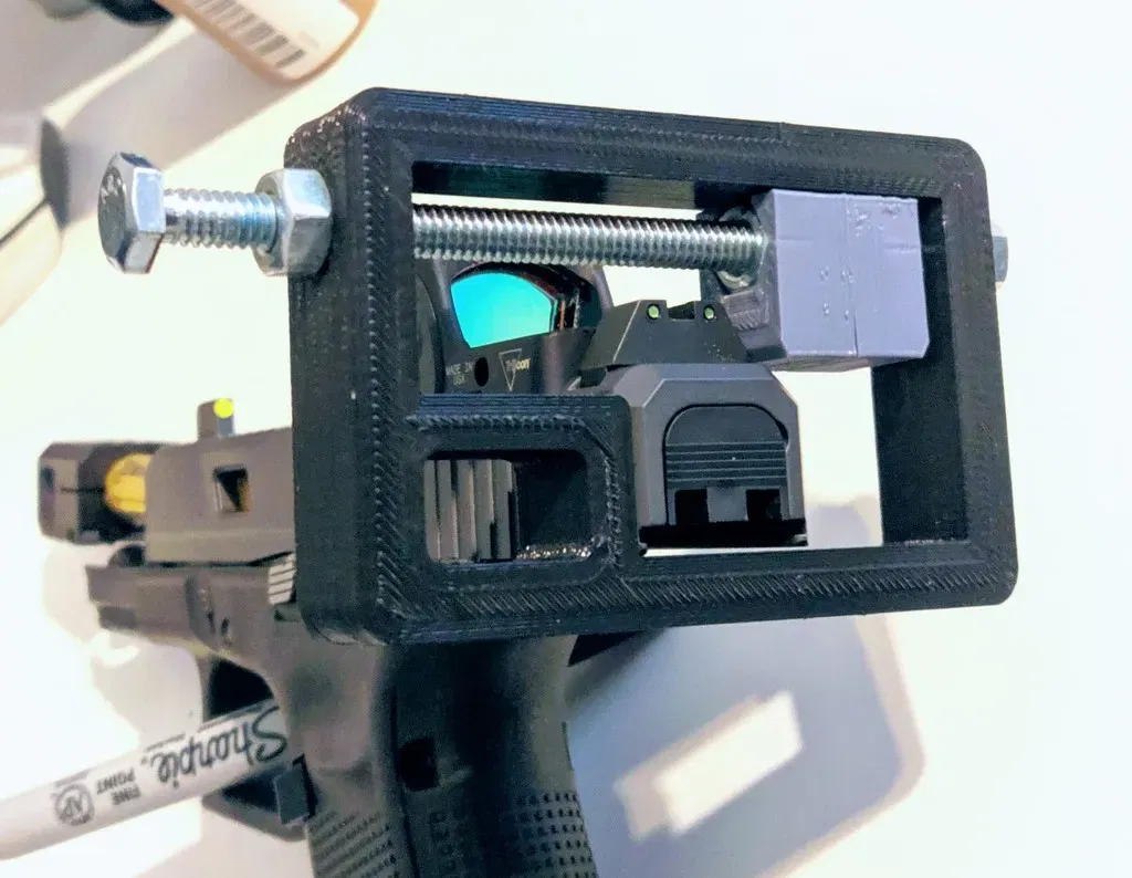 Phiên bản dụng cụ đẩy kính ngắm Glock nhỏ gọn, in nhanh, dùng ốc vít phổ biến và có thể xử lý kính ngắm chống ồn cao tới 0.6 inch. Tương thích với hầu hết các slide Glock, chỉ cần một ít phần cứng thông thường để lắp ráp.