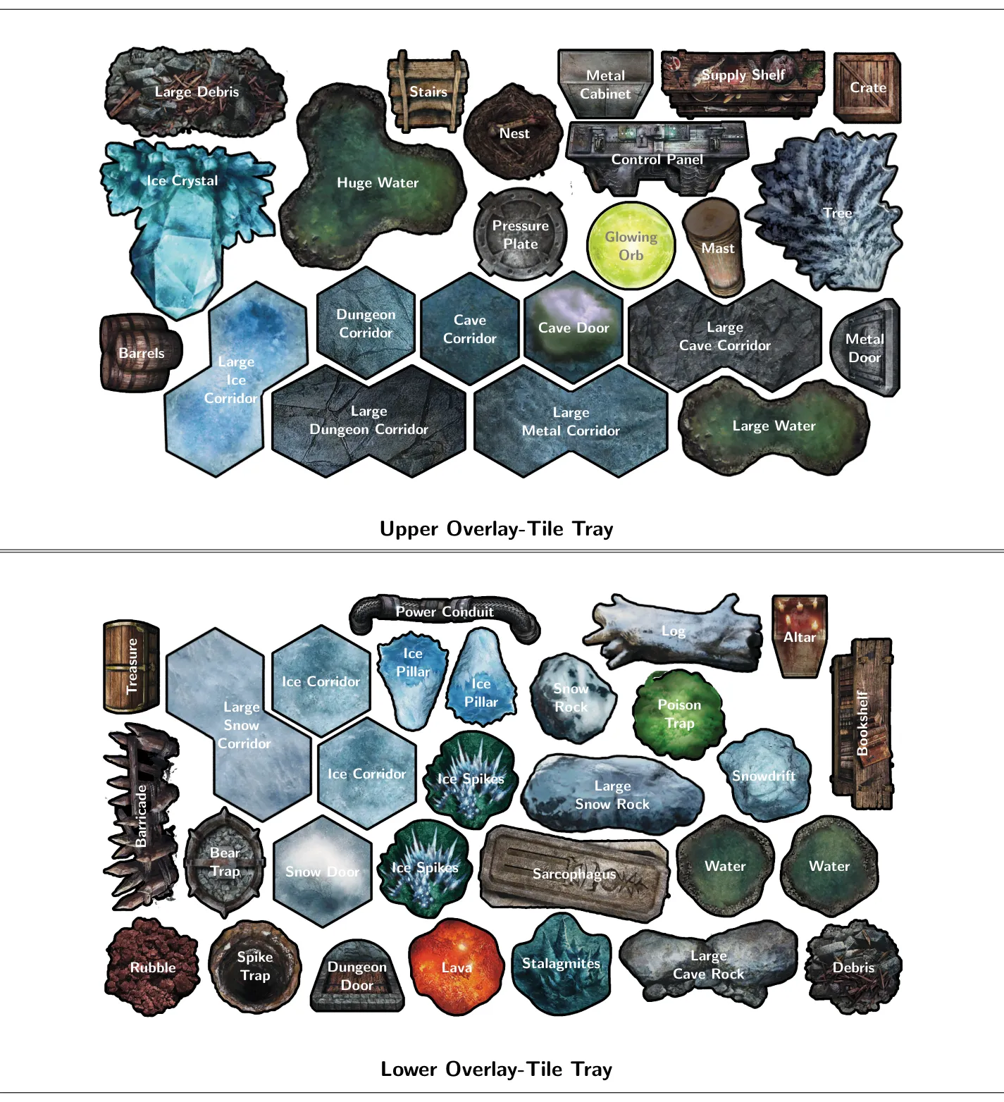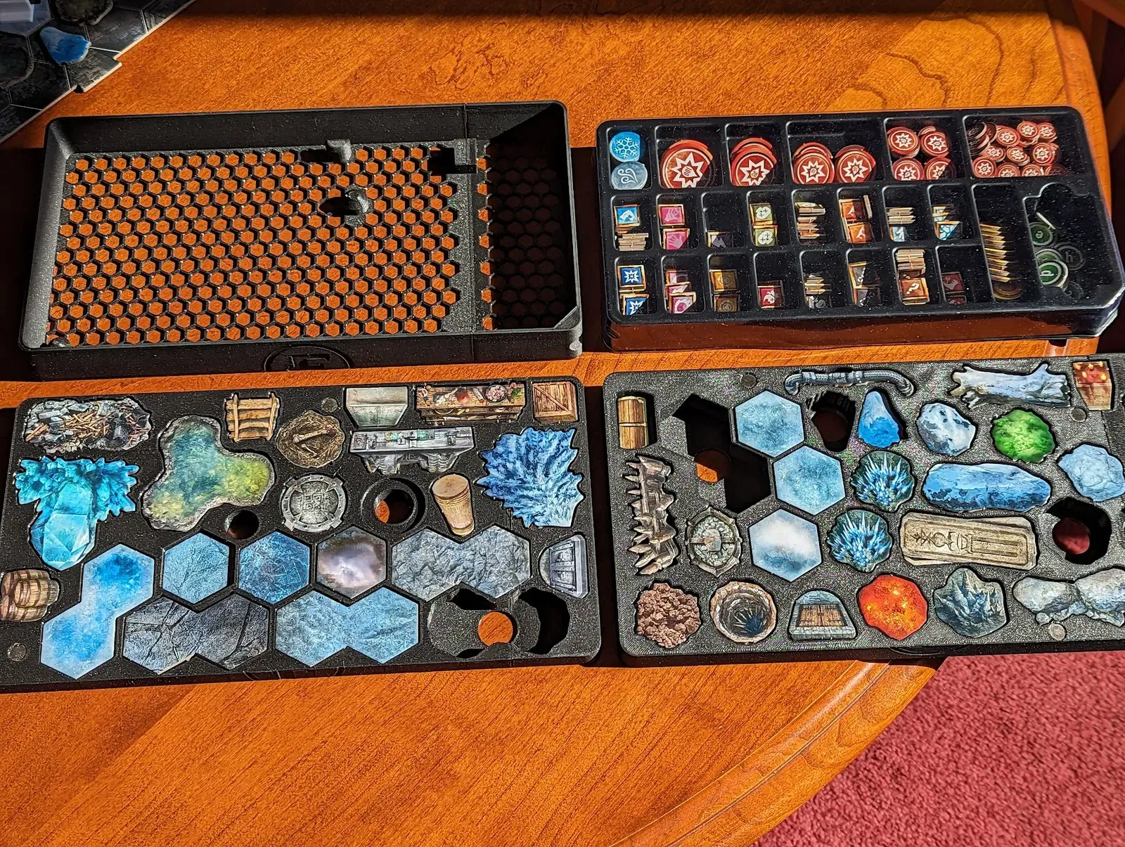 Nhiều ô phủ lên trông có vẻ có thể đặt vào khay của chúng theo nhiều cách khác nhau. Ví dụ bao gồm Rubble, Debris, một số bẫy, Water, Nest, và Pressure Plate. Chỉ có một cách đặt là đúng. Bản in này bao gồm các tệp PDF "Storage key" chỉ rõ cách mỗi ô phải được đặt để vừa với bộ sắp xếp. Hầu hết các ô phải được đặt đúng như trong ảnh khóa, nếu không chúng sẽ không vừa. (Các hình lục giác và hành lang lớn thì dễ hơn.)