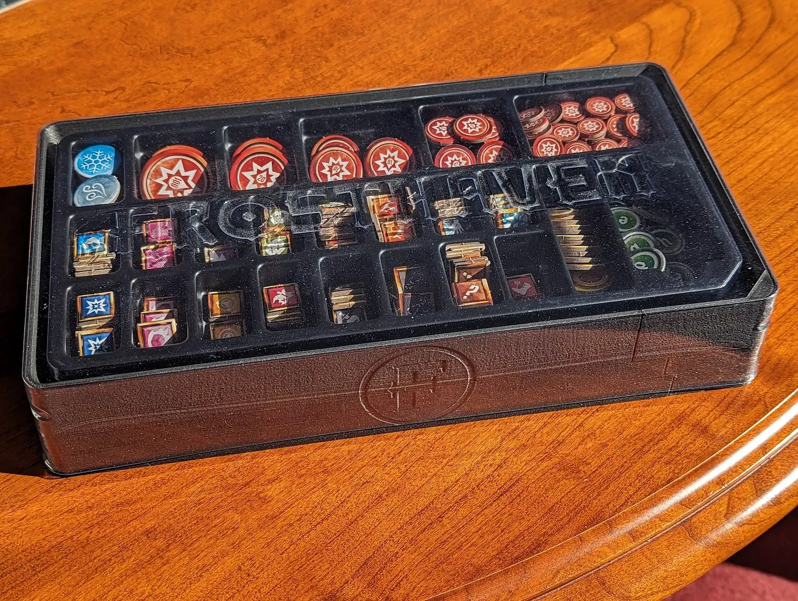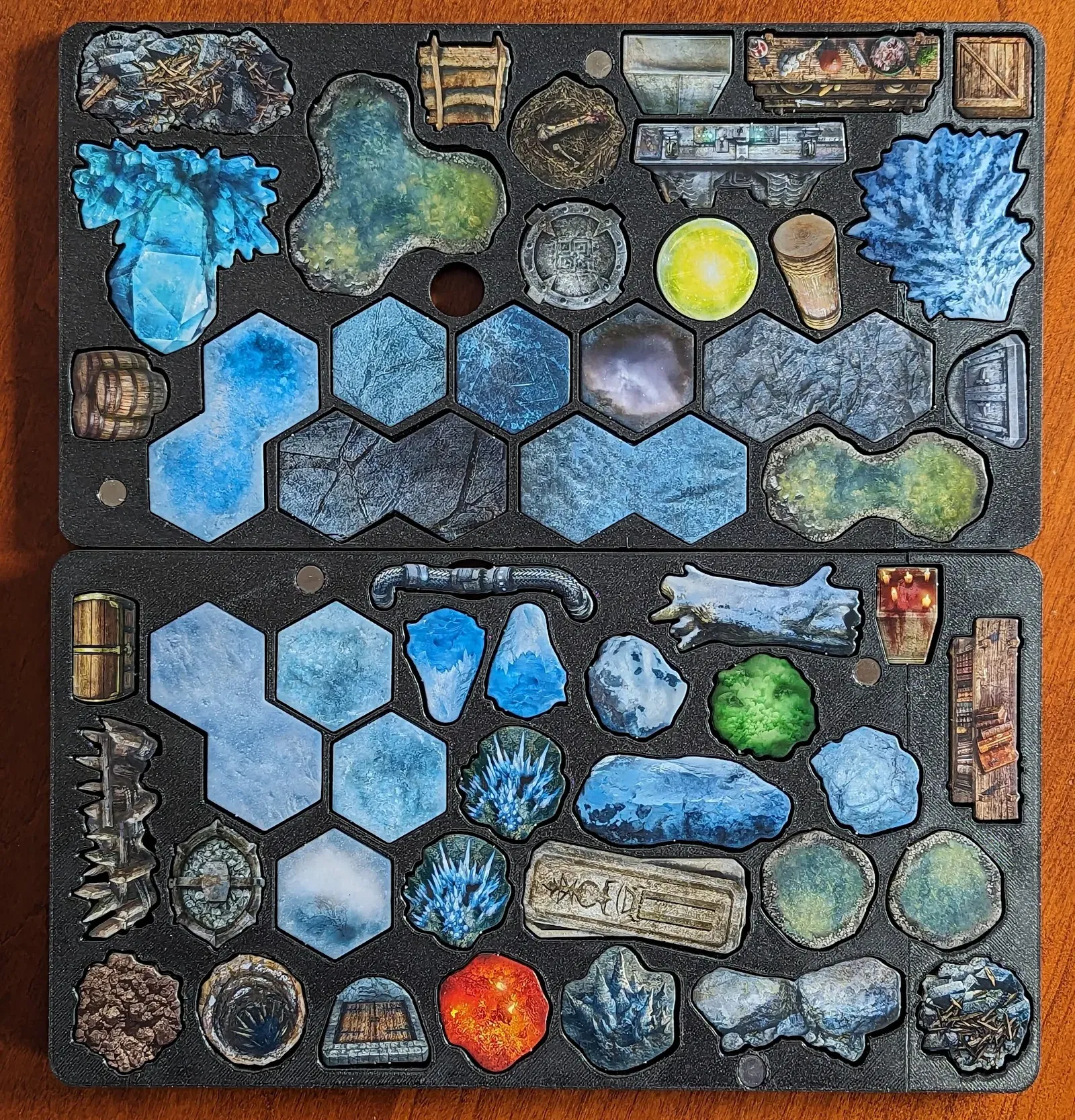 Cái mẫu này là để chứa và sắp xếp mấy cái ô vuông phủ lên của Frosthaven. Cái bộ sắp xếp này thay thế cho một trong mấy cái khay có sẵn trong hộp.
