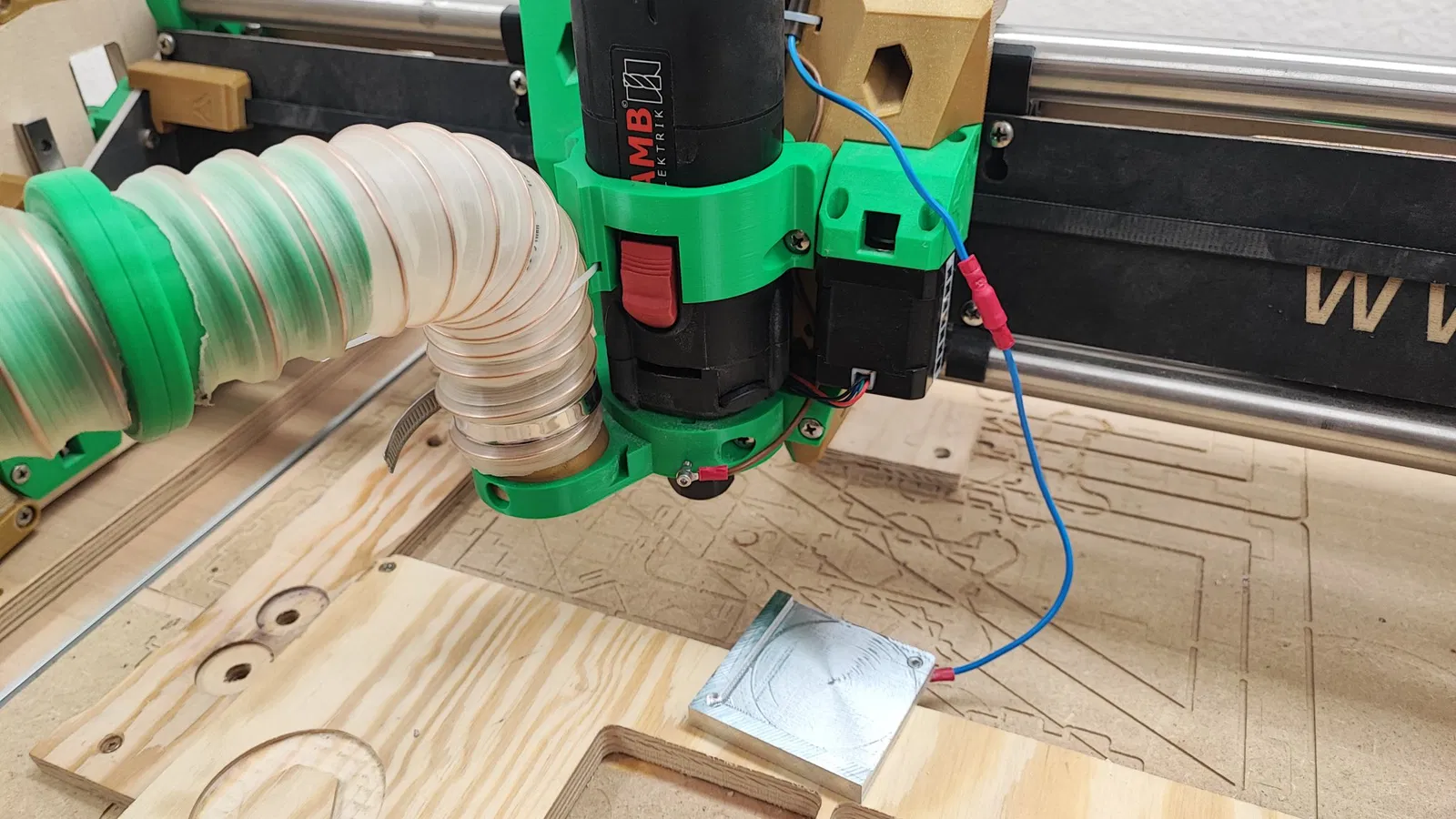 Bạn cũng có thể thấy một con ốc nhỏ có dây cáp ở phía trước giá đỡ, được cố định bằng đai ốc nyloc M3 gắn chìm. Con ốc chạm vào thân trục chính và nối đất nó để bạn có thể làm việc với tấm cảm ứng mà không cần kẹp cá sấu. Chỉ cần đặt tấm cảm ứng (có thể tháo rời) bên dưới nó là xong. Ngoài ra còn có các lỗ cho nam châm 5x4 (như trong chụp hút bụi) để đóng khoảng trống nhỏ ở đó. Một cặp nam châm là đủ, có thể dùng hai.