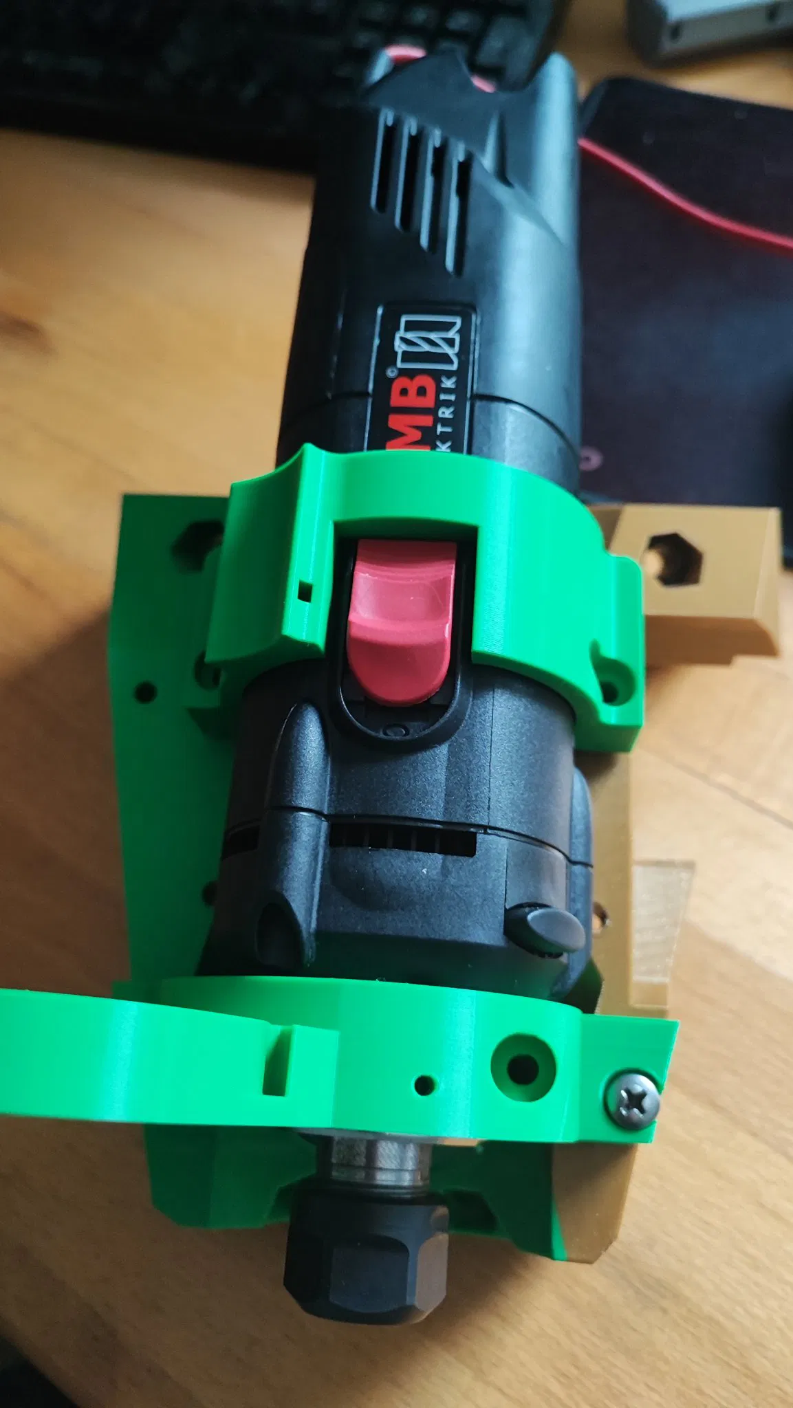 Bạn chỉ cần in mỗi bộ phận một lần, không có giá đỡ ở giữa, không giống như các giá đỡ cho Makita, Kobalt v.v. vì giá đỡ chính là cái ở dưới và cái ở trên chỉ thêm một chút độ ổn định. Router được giữ trong giá đỡ bằng một ốc vít bổ sung.