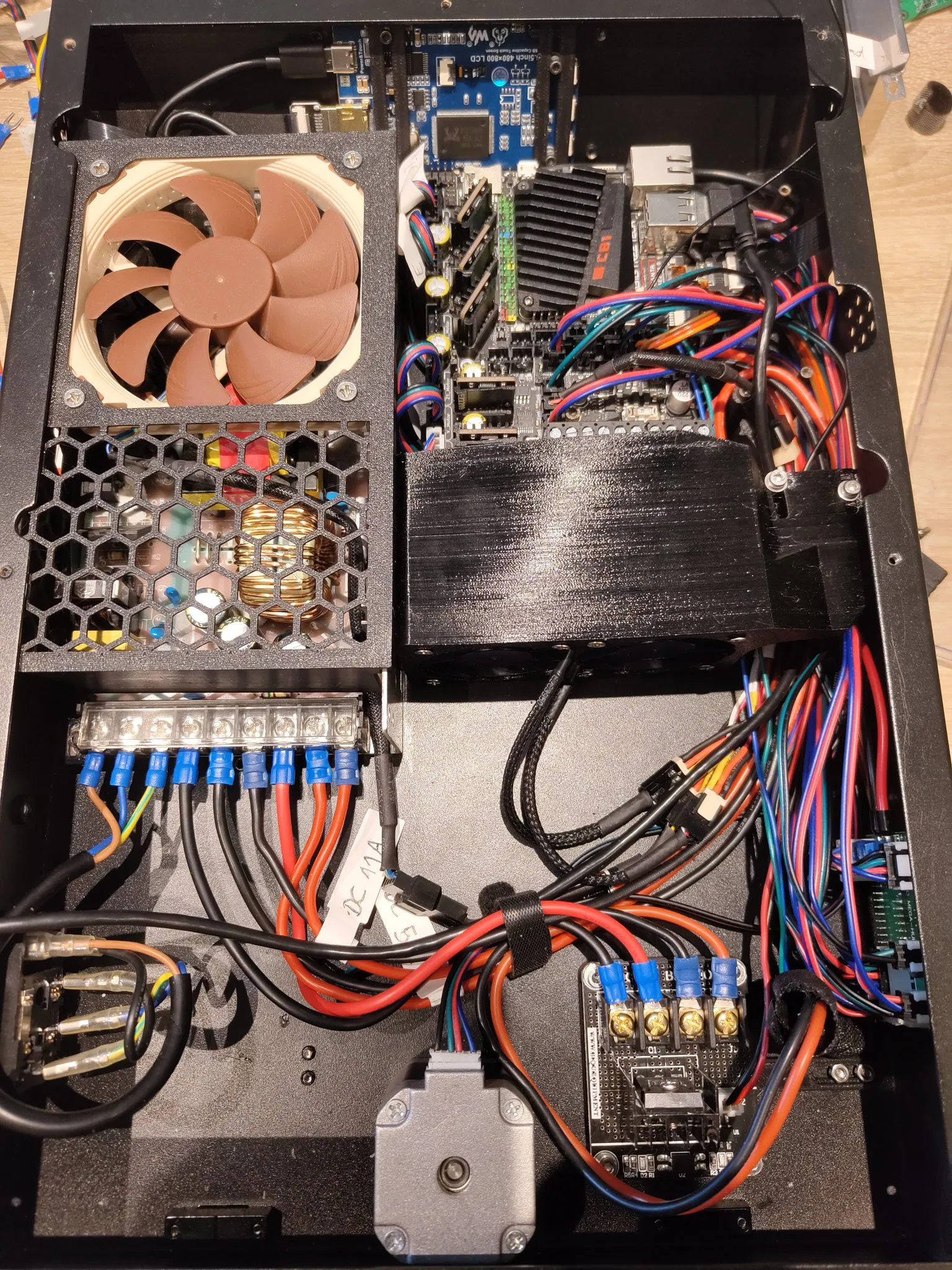 Các quạt được lắp vào giá đỡ rồi giá đỡ được gắn vào máy in bằng 2 con vít dài. Có hai trụ đỡ đặt cạnh nhau, không thẳng hàng lắm, nên tôi đã làm các lỗ gắn "hơi" trượt. Tôi in giá đỡ quạt bằng tpu và vì vậy cũng đã dùng long đền.