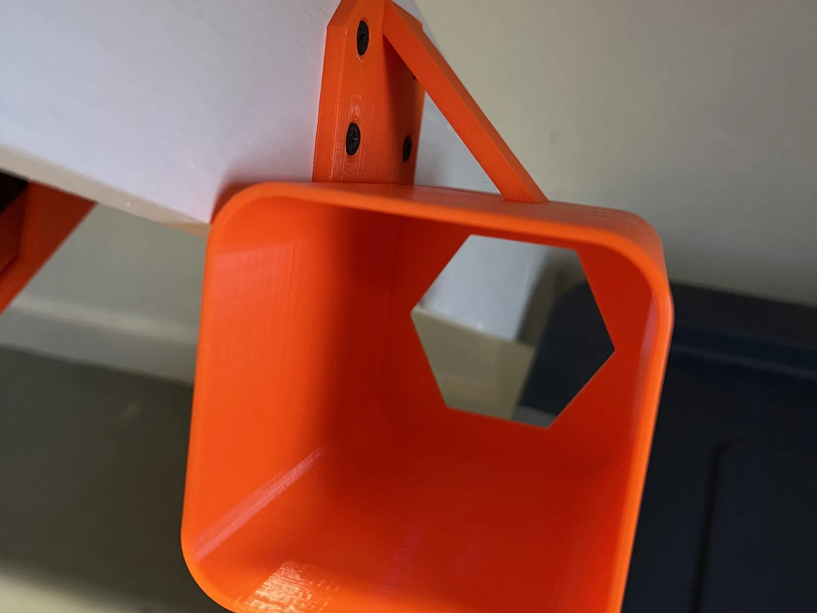 Kệ này có kích thước bên trong 3.05" x 3.05", được thiết kế để treo chai Isopropyl dưới gầm bàn hoặc tủ. In bằng PLA, lớp dày 0.25mm, mật độ infil 20%. Thích hợp cho nhu cầu lưu trữ gọn gàng và tiện dụng.