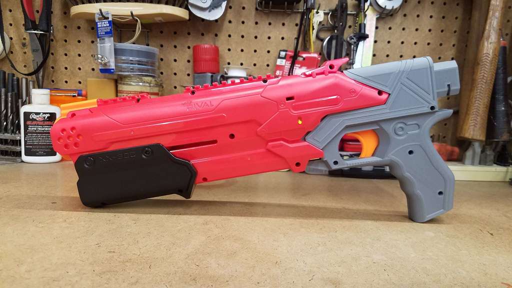 Đây là 2 phiên bản của mình về Tay cầm Nerf Rival Takedown của haphazardlynamed (https://www.thingiverse.com/thing:4418085). Một phiên bản chỉ có tay cầm, phiên bản còn lại có thêm điểm gắn báng súng tương thích với mọi loại báng N-Strike.