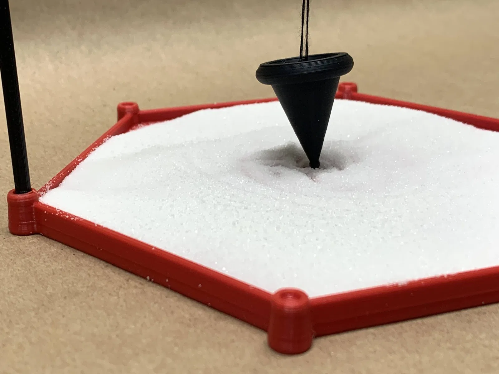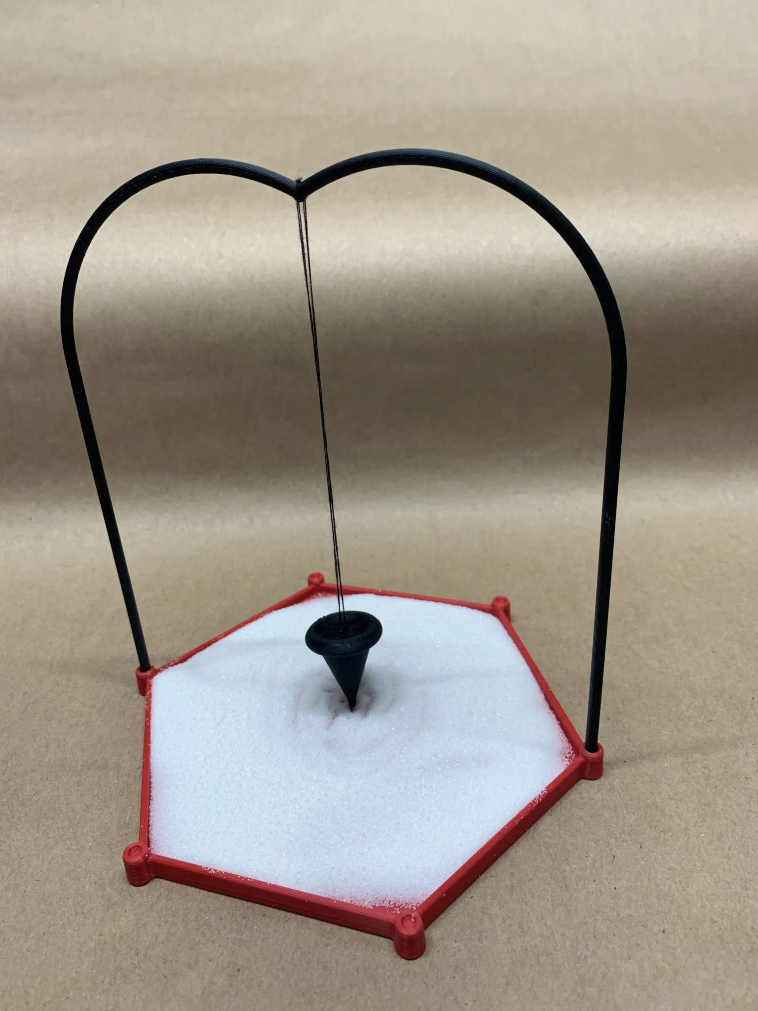 The arch structure should friction fit in the base. Supply your thread or string to hang the pendulum. It is fun to play with, sliding around gently on the table or desk to create patterns. Fill with sand, salt, sugar, or whatever! Printed in PLA at 0.20 layer height, 0.4mm nozzle.