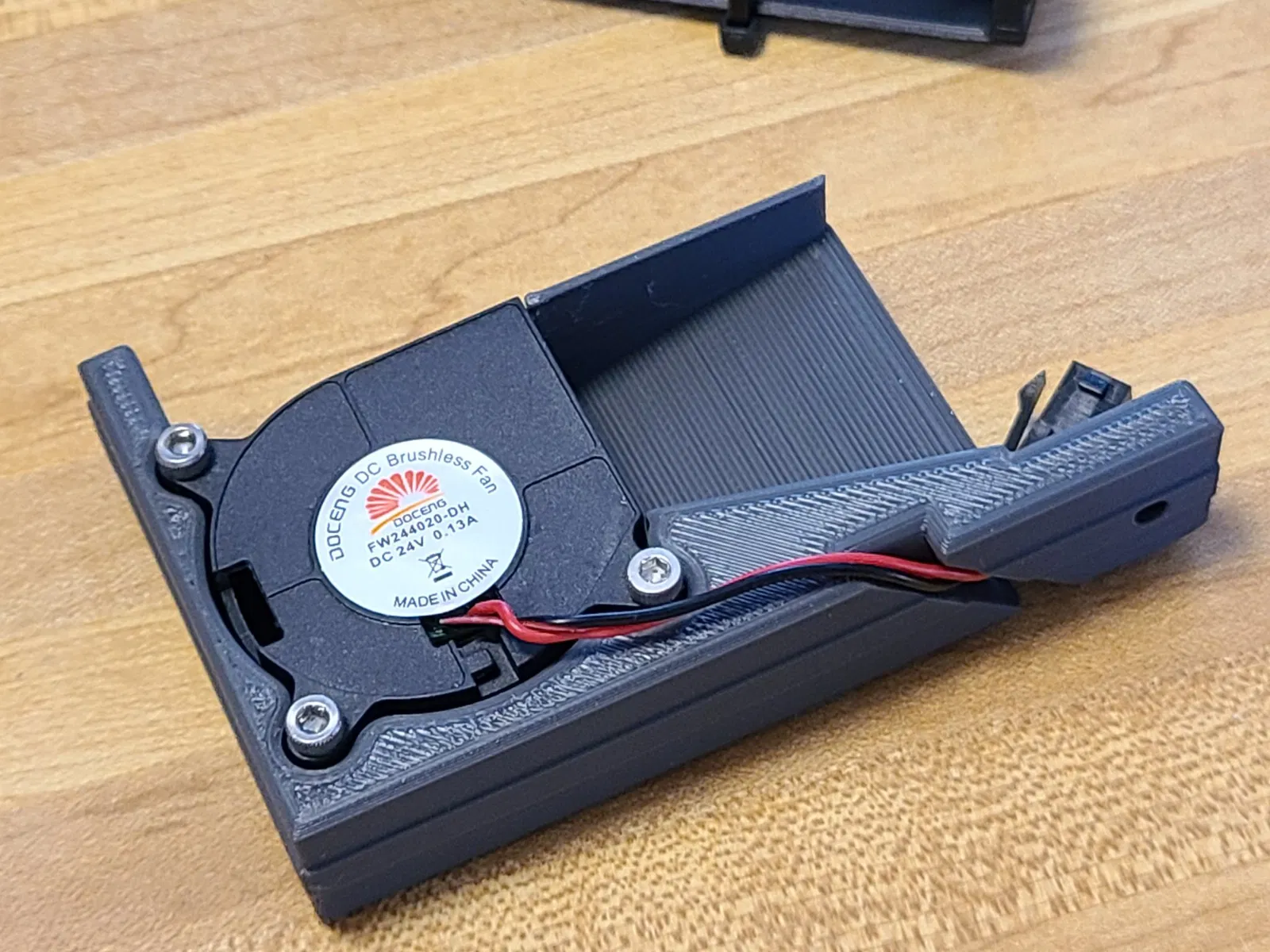 Nó không chỉ bao gồm nửa còn lại của vỏ quạt và giá đỡ để gắn vào thanh nhôm, mà còn có chức năng định hướng luồng khí thổi ra từ quạt về phía bàn in và làm lan tỏa nó. Về lý thuyết, nó sẽ hiệu quả hơn các thiết kế chỉ thổi khí trực tiếp ra khỏi quạt dưới bàn in.