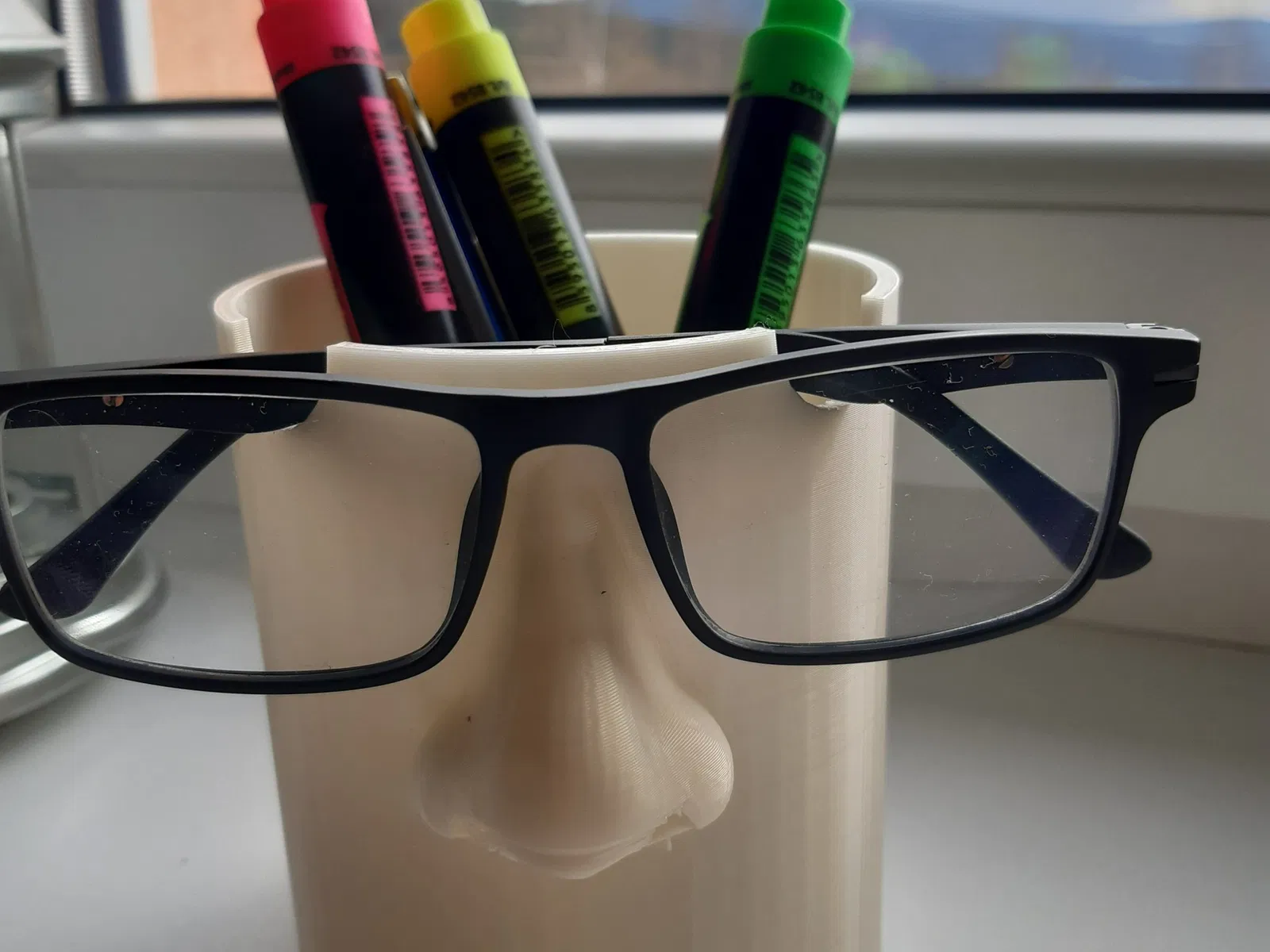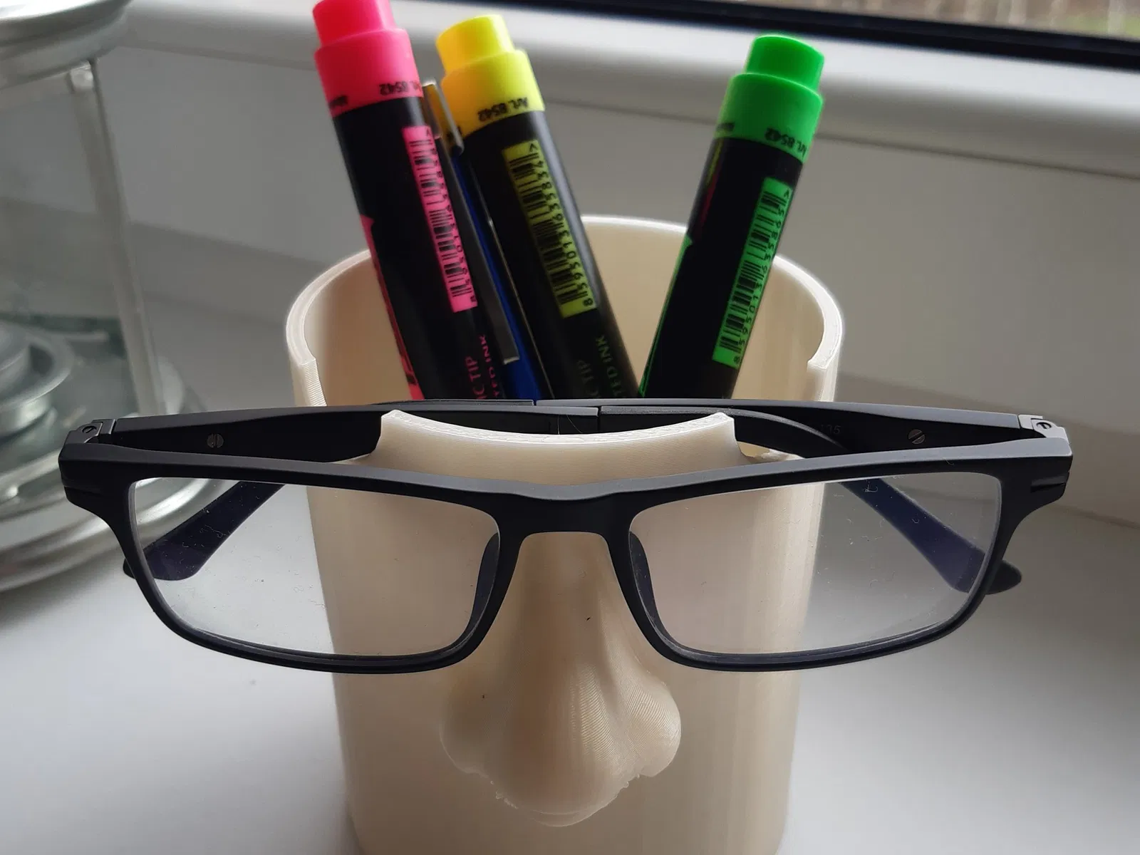 Có văn phòng phẩm và kính ngay trong tay. Một người tổ chức kết hợp cả giá đỡ bút chì và người giữ kính bảo hộ.