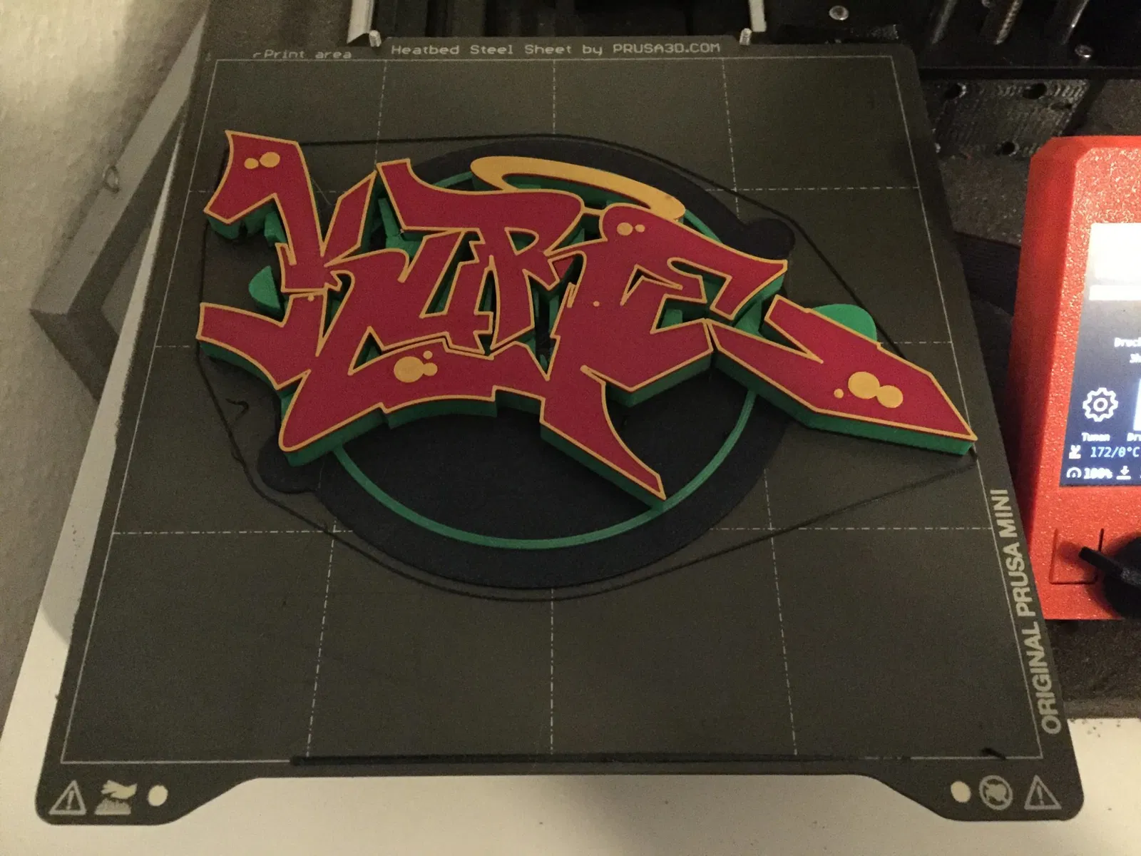 Causeturk đã cung cấp cho tôi các tệp .svg của thiết kế này và từ đó tôi chỉ cần thực hiện một vài thay đổi nhỏ đối với thiết kế trong Inkscape và sau đó là Fusion360. Người dùng cần quyết định xem các phần nào của graffiti sẽ được đùn ở độ cao Z nào, tương ứng với các lần thay đổi màu.