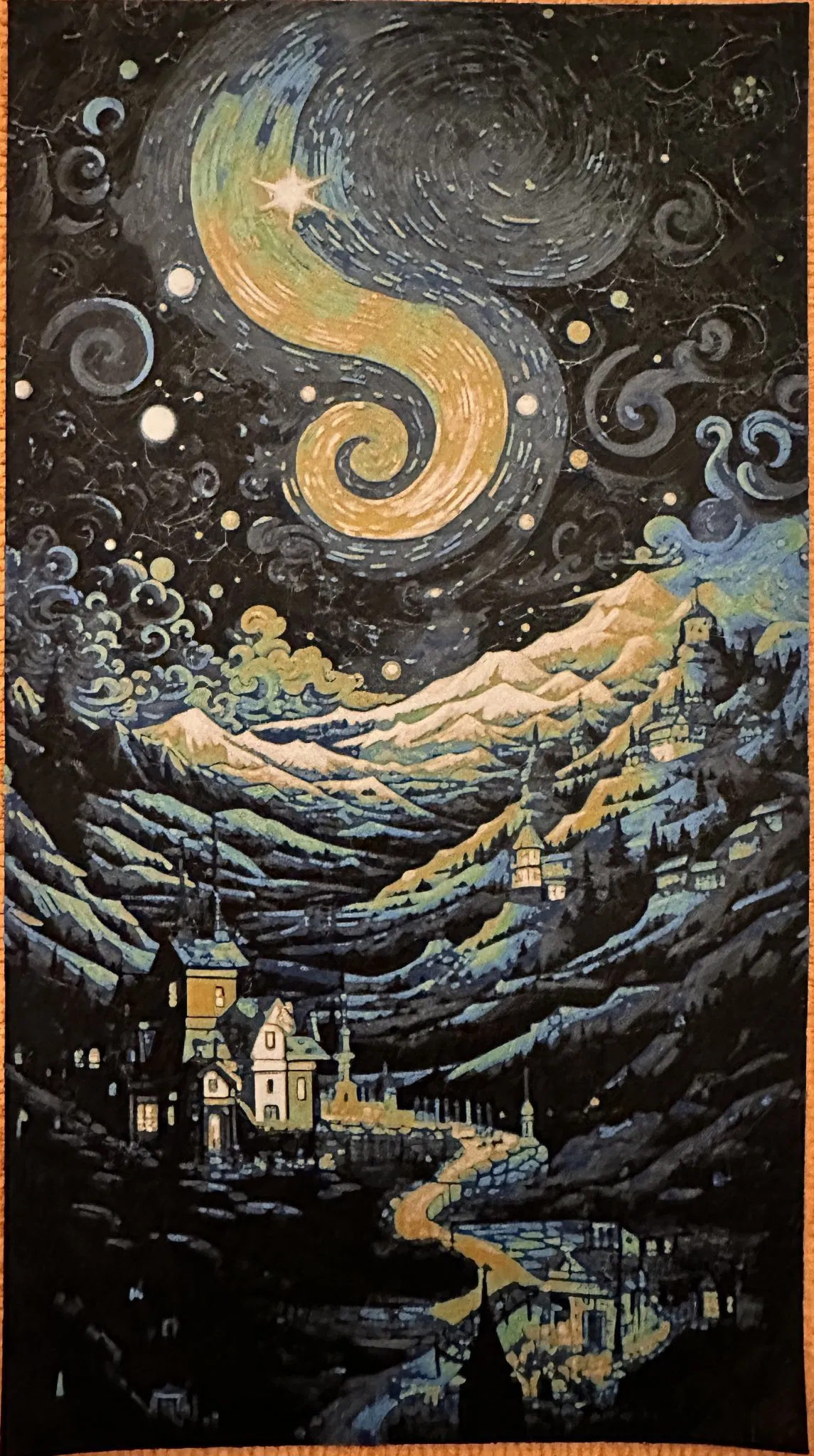 This is Starry Night Redux, a Hue Forge, filament painting using 8 colors.