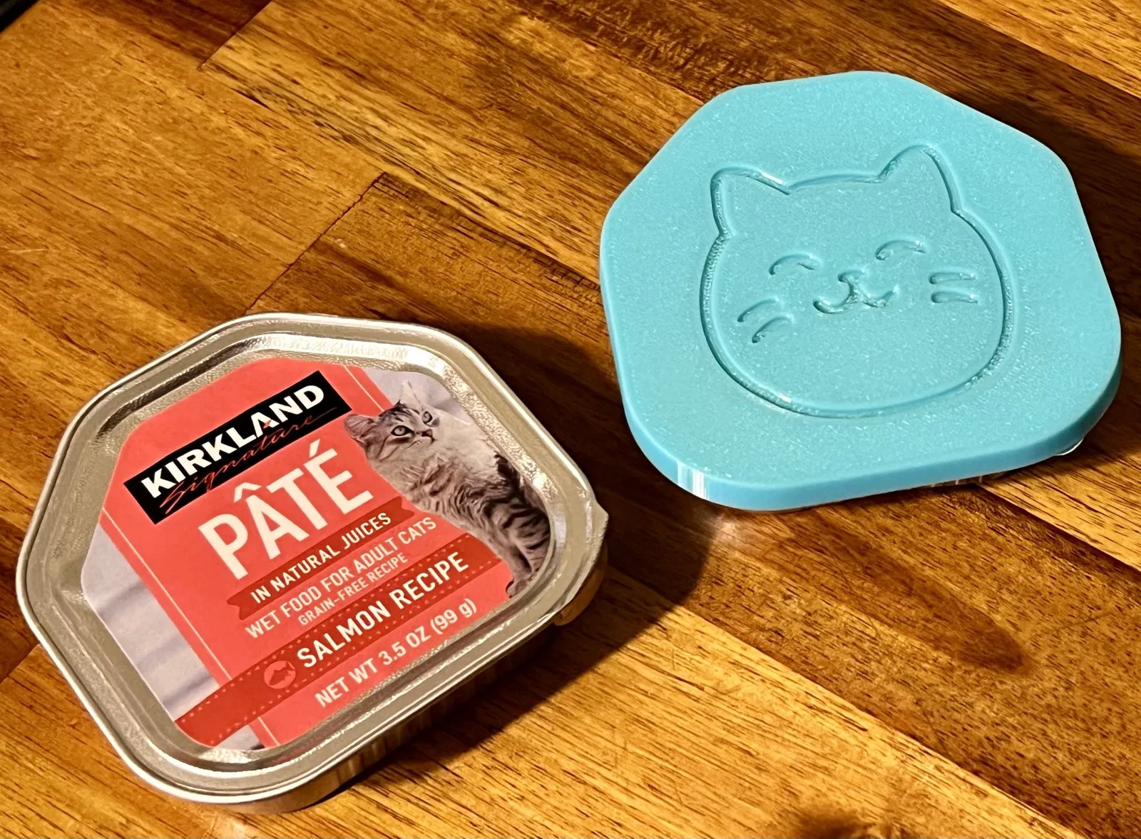 Nắp đậy cho thức ăn mèo Kirkland hiệu pâté từ Costco. Loại thức ăn này đựng trong hộp có hình dáng hơi kỳ lạ, mấy cái nắp lon thông thường đều không vừa. Nên tui tự chế một cái. Con mèo nhà tui mỗi ngày ăn có nửa lon thôi, nên cái nắp này giúp giữ thức ăn tươi cho bữa sau.