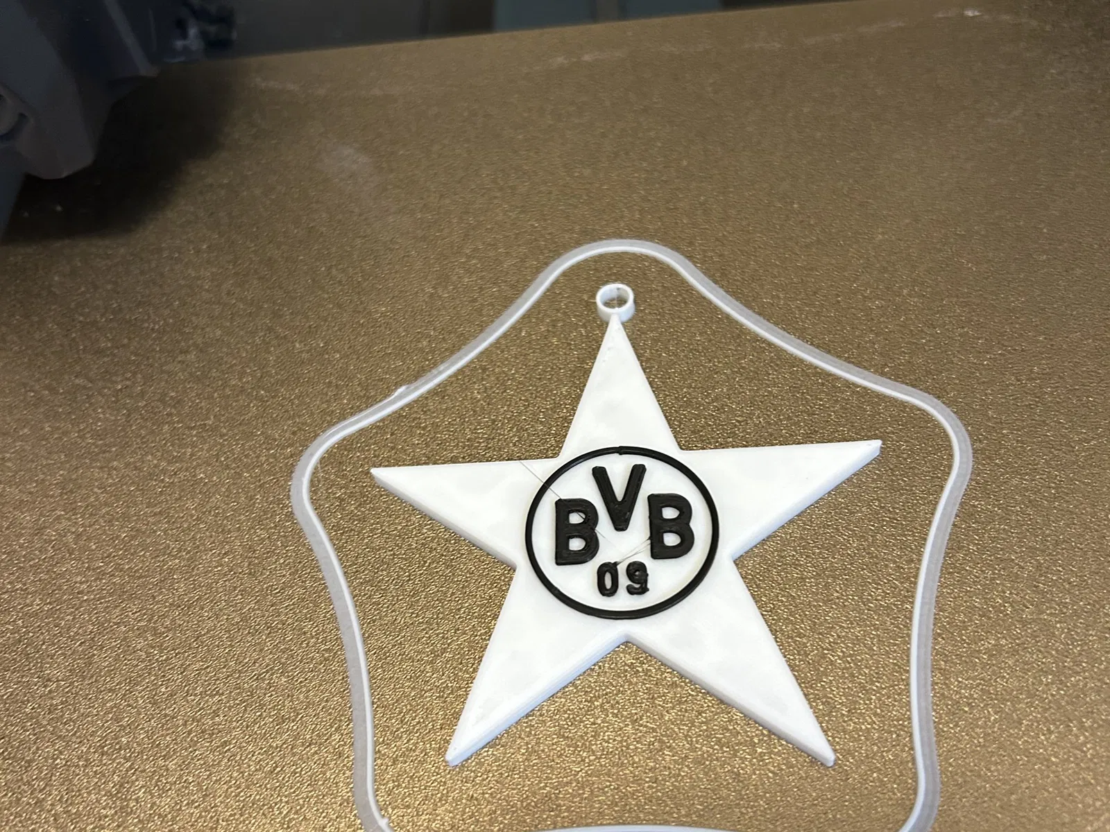 Một ngôi sao BVB độc đáo để trang trí cây thông Noel của bạn. Với sợi filament phù hợp, bạn có thể tạo hiệu ứng chữ đen trên nền sao vàng rực rỡ, mang đậm không khí Giáng Sinh và niềm tự hào Borussia Dortmund.