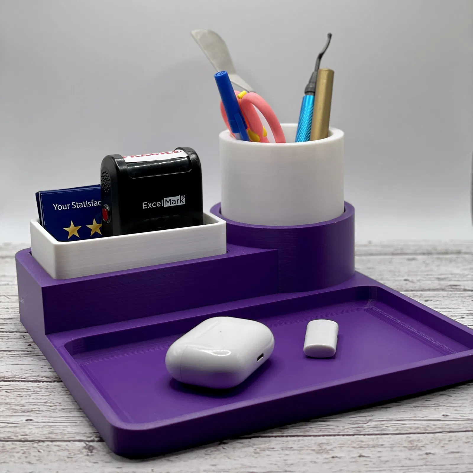 Sắp xếp bàn làm việc của bạn! Bộ tổ chức bàn này có 2 ngăn giúp giữ cho bàn làm việc của bạn gọn gàng và ngăn nắp. Sử dụng hộp hình chữ nhật để chứa danh thiếp hoặc bất kỳ thứ gì khác mà bạn có thể nghĩ đến. Giá đỡ bút có thể được sử dụng cho, ừm, bút chì (và thực sự bất cứ thứ gì bạn muốn). Nó cũng có thể được sử dụng như một bao đựng lon (có thể chứa bất kỳ lon 12oz tiêu chuẩn nào). Thân chính có thể được sử dụng để giữ AirPods, USB hoặc thậm chí một bộ điều khiển trò chơi ;-).