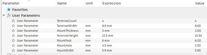 Tui đã để tất cả các số đo trong "Tham số người dùng" (User Parameters) của Fusion 360, vì vậy bạn có thể điều chỉnh cho phù hợp với sự khác biệt của từng nhà sản xuất. Hãy thay đổi "TerminalCount" thành số lượng đầu nối bạn cần và nó sẽ tự động mở rộng theo. Tui mới in thử cho tối đa 6 đầu nối, nên không biết nó hoạt động tốt thế nào khi số lượng lớn hơn. Các cạnh có bo tròn 0.4mm nên sẽ in đẹp mà không cần hỗ trợ hay vành (brim). Tui đã dùng cài đặt mặc định của Orca "0.2mm Strength" (0.4 noz, Bambu PLA Basic, 6 lớp tường, điền lưới @ 25%) cho P1P và mọi thứ đều ổn. Mất khoảng một giờ để in một lô 11 cái.