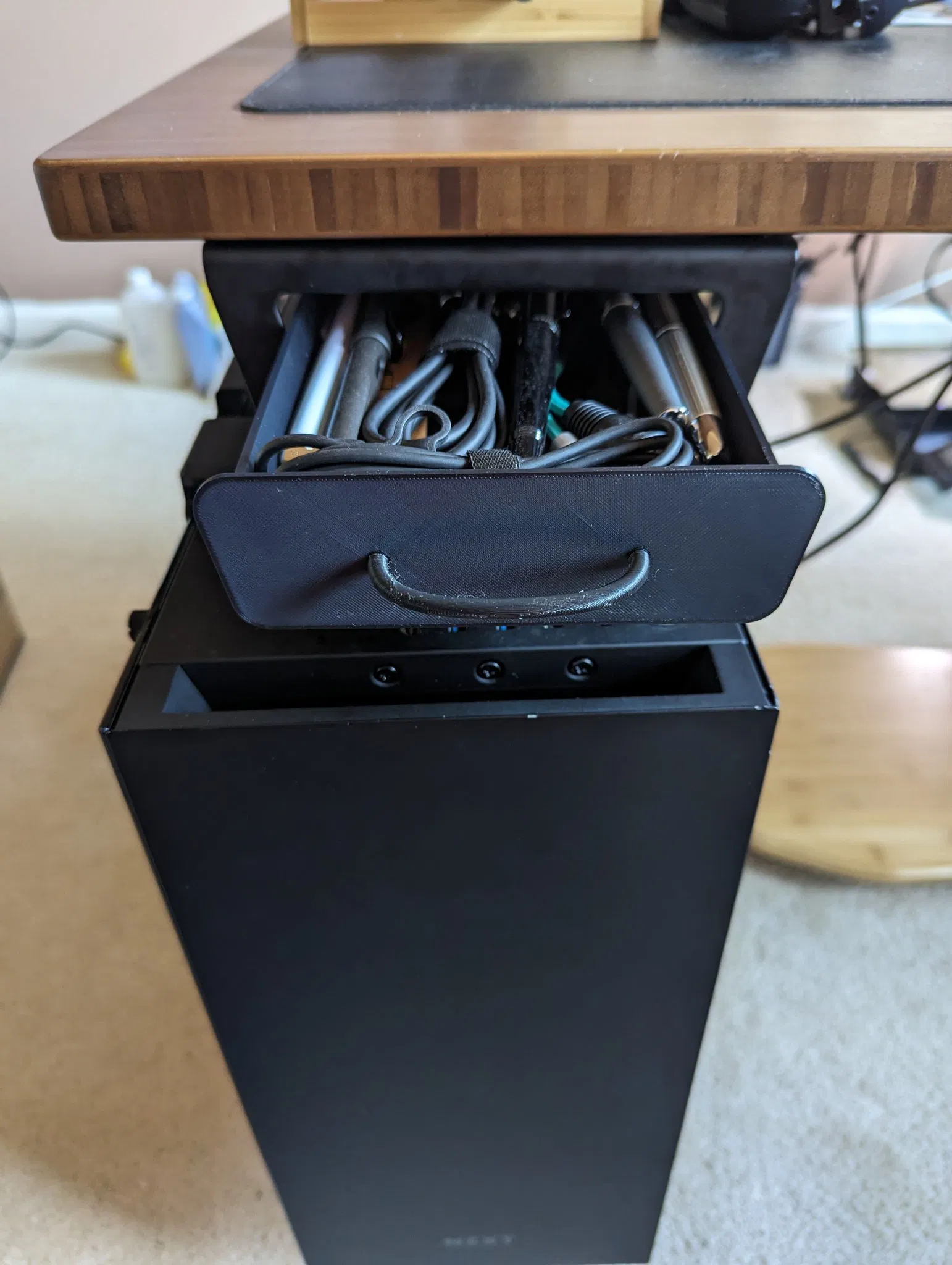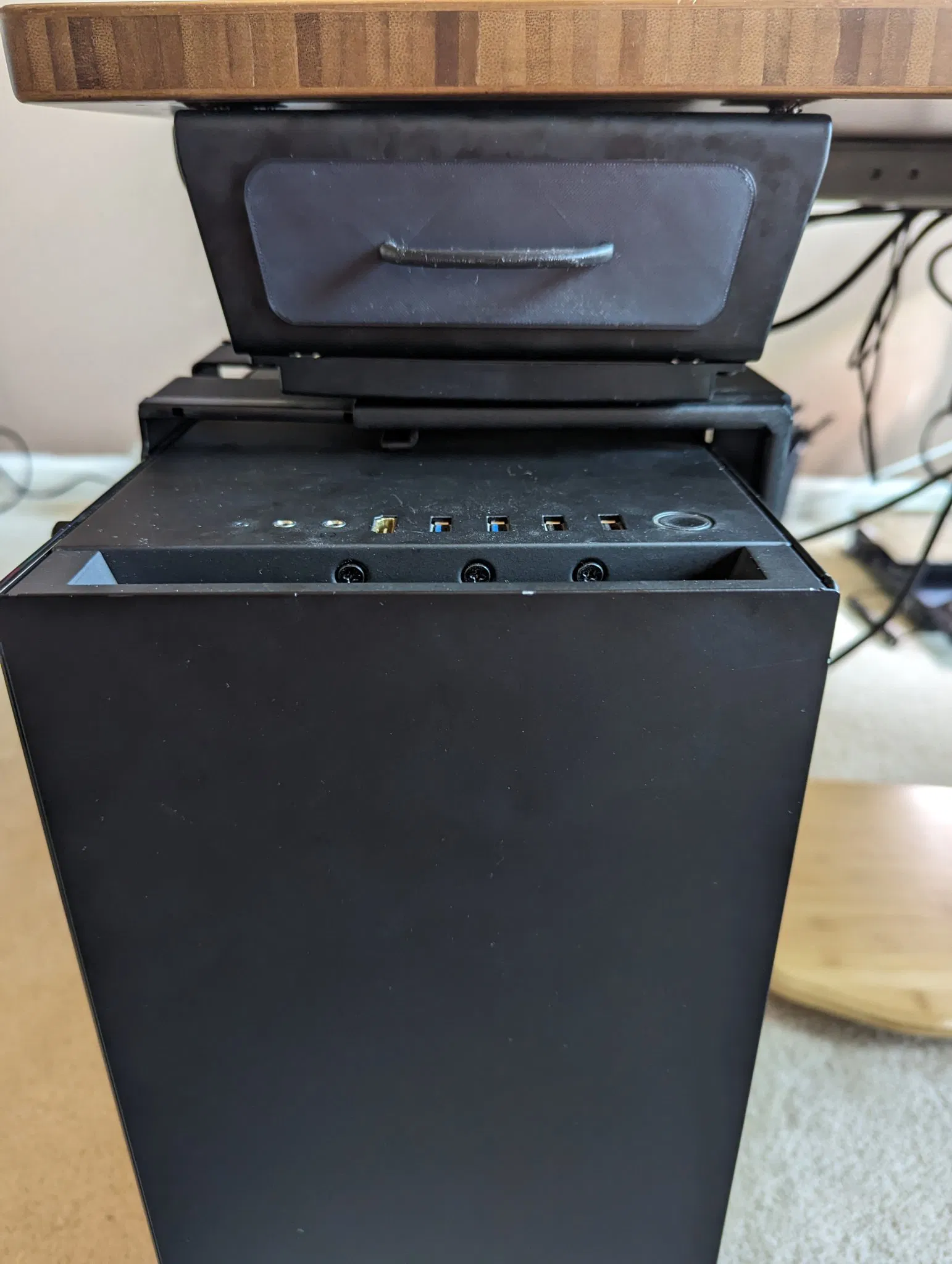 Tôi có mua một chiếc bàn Uplift Desk, nhưng tôi thấy cái hộc tủ phía trên giá đỡ CPU của nó gần như vô dụng. Cái lỗ không đủ cao để lấy được bất cứ thứ gì không nằm ngay phía trước. Tôi muốn làm cho nó hữu dụng hơn, nên tôi nghĩ là một cái ngăn kéo là thứ phù hợp cho việc này.
