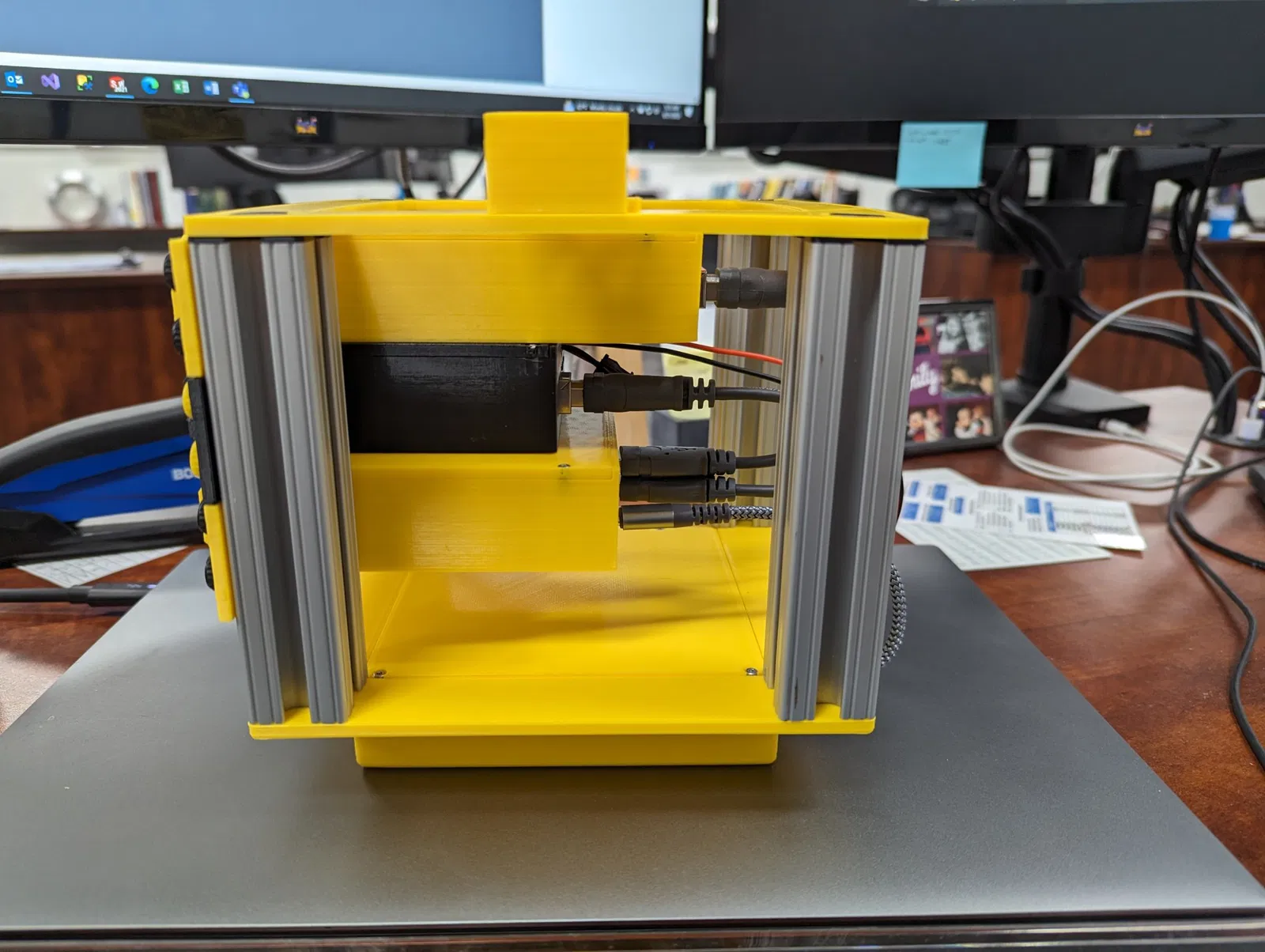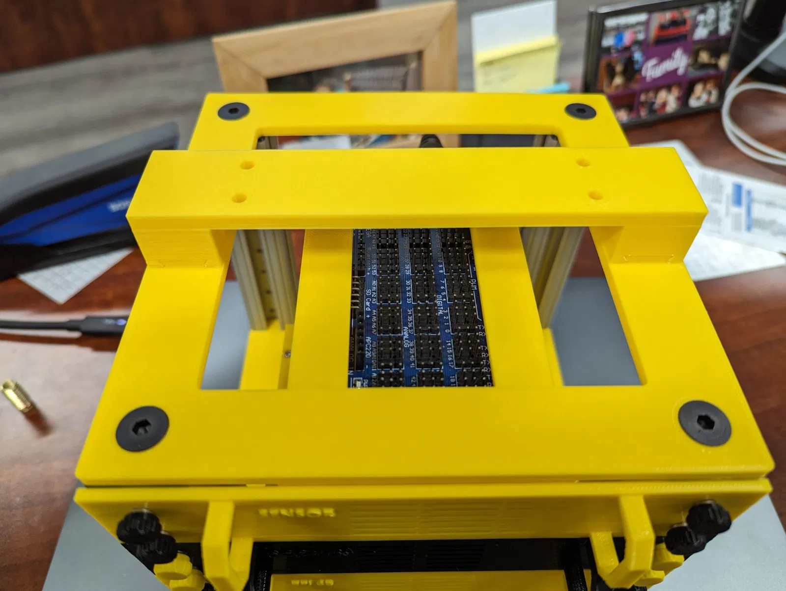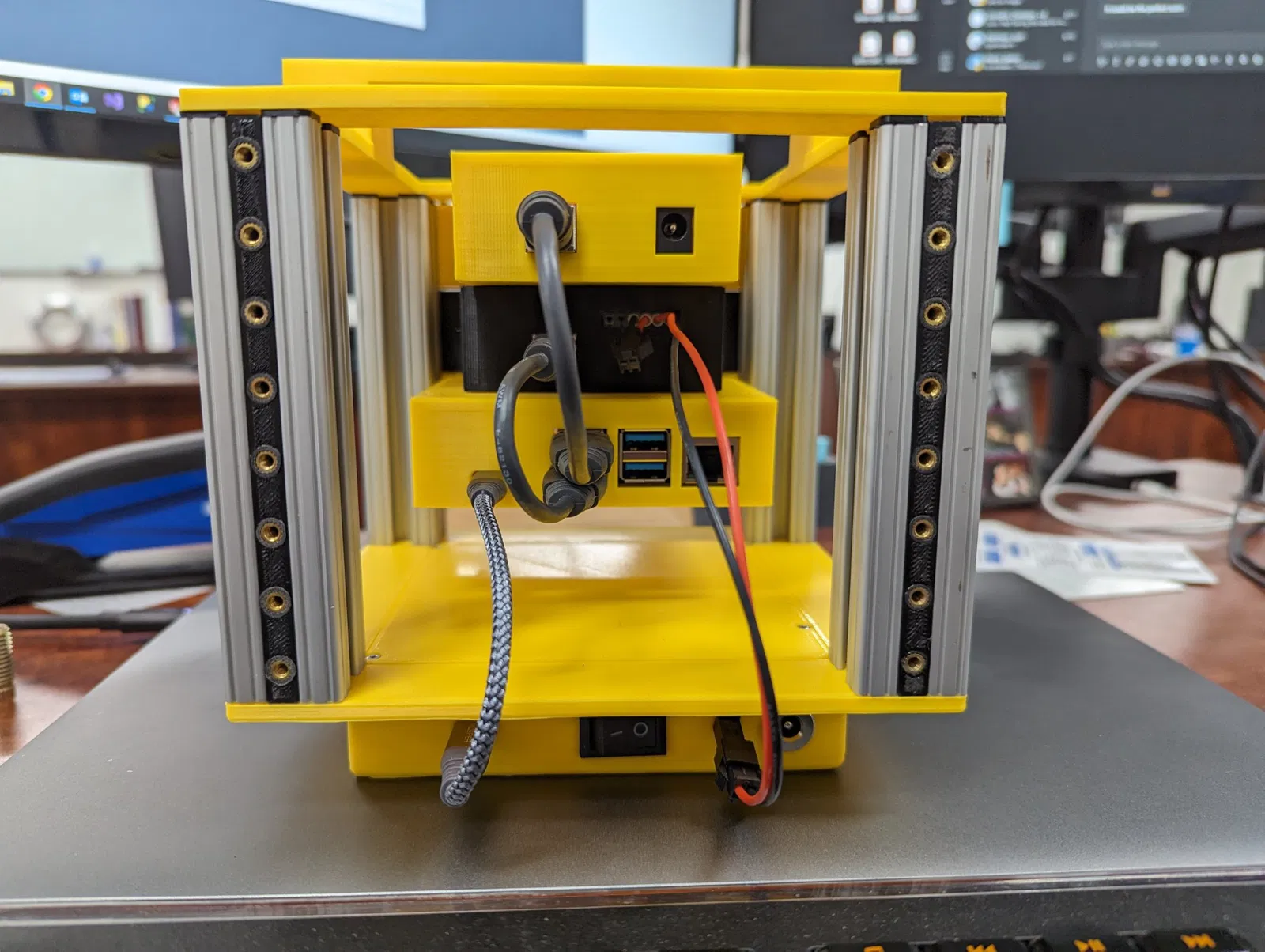 Đây là một giá nhỏ để giữ và cung cấp năng lượng cho toàn bộ thiết lập DCC++EX của tôi. Tôi đang sử dụng Raspberry Pi 4B chạy JMRI, một Arduino Uno hoặc Mega với hoặc là mạch động cơ DCC++EX hoặc là mạch động cơ Deek Robot (bản sao Arduino) và một Arduino Mega với một mạch cảm biến. Cơ sở chứa tất cả phân phối điện cho toàn bộ giá cùng với một công tắc bật tắt. Pi được cấp nguồn thông qua một bộ chuyển đổi buck sau đó cung cấp cho một bảng breakout USB-C. Bảng này sau đó được kết nối với một bảng breakout USB-C khác, rồi cấp nguồn cho Pi qua các chân GPIO. Giá sử dụng các thanh nhôm dài 120mm có kích thước 1". Các lỗ trên cùng đã được khoan để lắp vít ¼ -20. BOM: (Xin lưu ý rằng các liên kết Amazon là liên kết liên kết) | Số lượng | Mô tả | Liên kết | |---|---|---| | 4 | Vít đầu phẳng ¼ -20 | https://www.mcmaster.com/91253A542/ | | 4 | Vít đầu nút ¼ -20 | https://www.mcmaster.com/97763A267/ | | 32 | M3 Heat Set Inserts (có 8 cái cho mỗi thanh) | https://www.mcmaster.com/94459A130/ | | 16 | M3 x 6mm SHCS | https://www.mcmaster.com/90751A110/ | | 32 | M2 Heat Set Inserts | https://www.mcmaster.com/94459A110/ | | 32 | M2 x 4mm SHCS | https://www.mcmaster.com/91292A004/ | | 1 | MP1584EN DC-DC Buck Converter | https://amzn.to/3smEWL6 | | 2 | Bảng breakout USB-C | https://amzn.to/3qDLIvq | | 1 | Jack hình trụ 2.1mm | https://amzn.to/3KO74Ny | | 1 | Công tắc Rocker SPST | https://amzn.to/3P5u655 | | 1 | Cáp USB-C đến USB-C dài 6in | https://amzn.to/3P2MAmK | | 2 | Cáp USB-A đến USB-C dài 6in | https://amzn.to/3qH53vO | Đối với các vít tay, tôi đã sử dụng <https://www.f3d.vn/3d-model/152559-che-tao-num-van-tay-thumb-screw-knob-don-gian