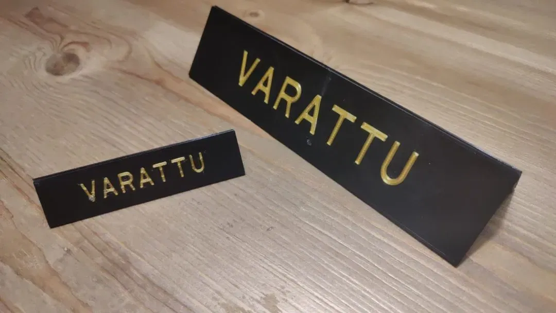 Cần đặt chỗ trên bàn (vì bất kỳ lý do gì)? Biển báo này sẽ giúp bạn. Thiết kế tối ưu vật liệu, có thể tùy chỉnh kích thước và có sẵn bản tiếng Anh/Phần Lan.