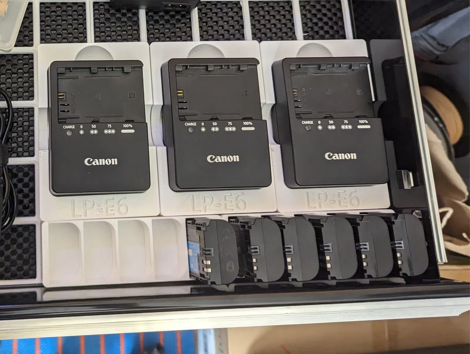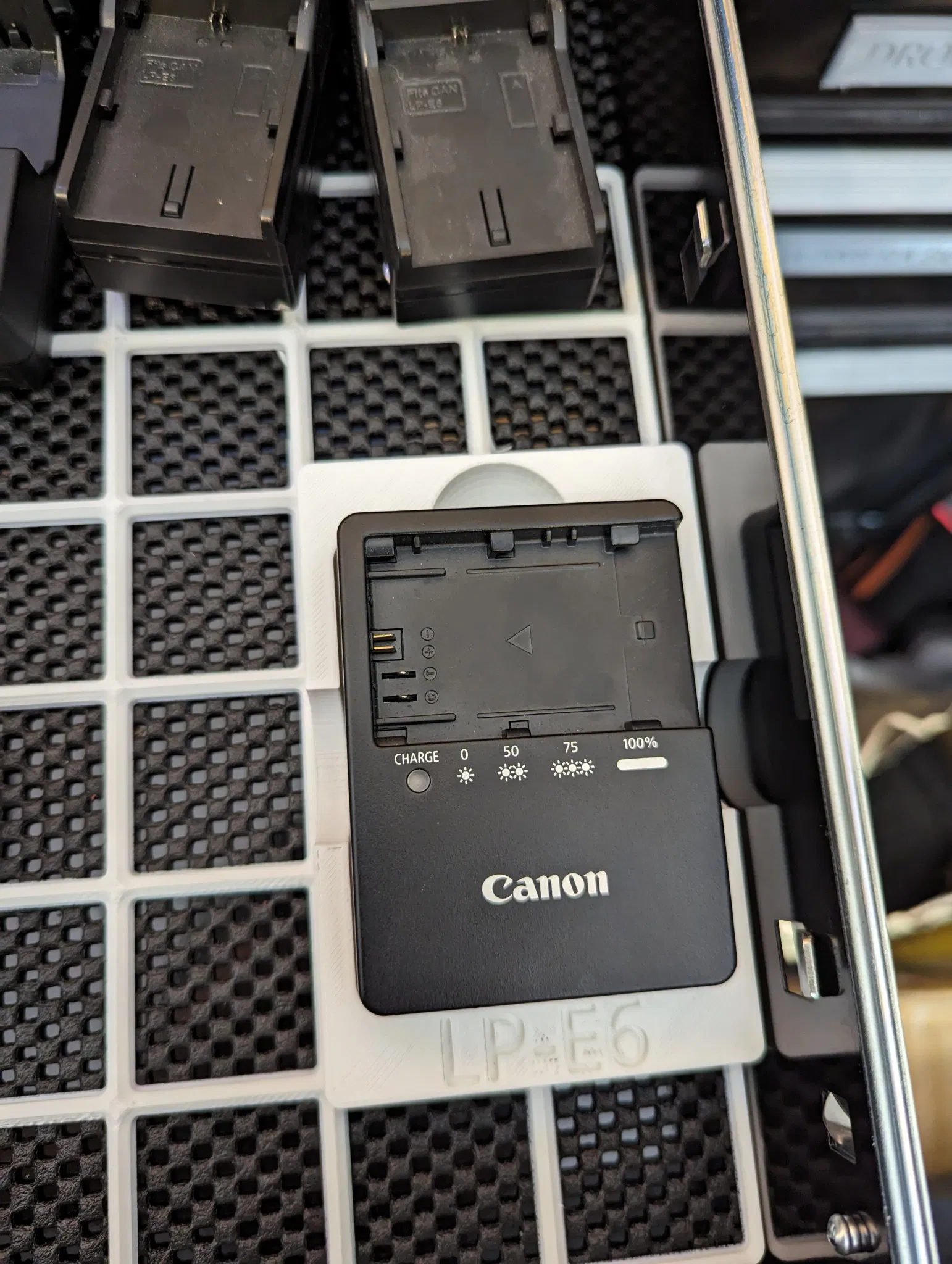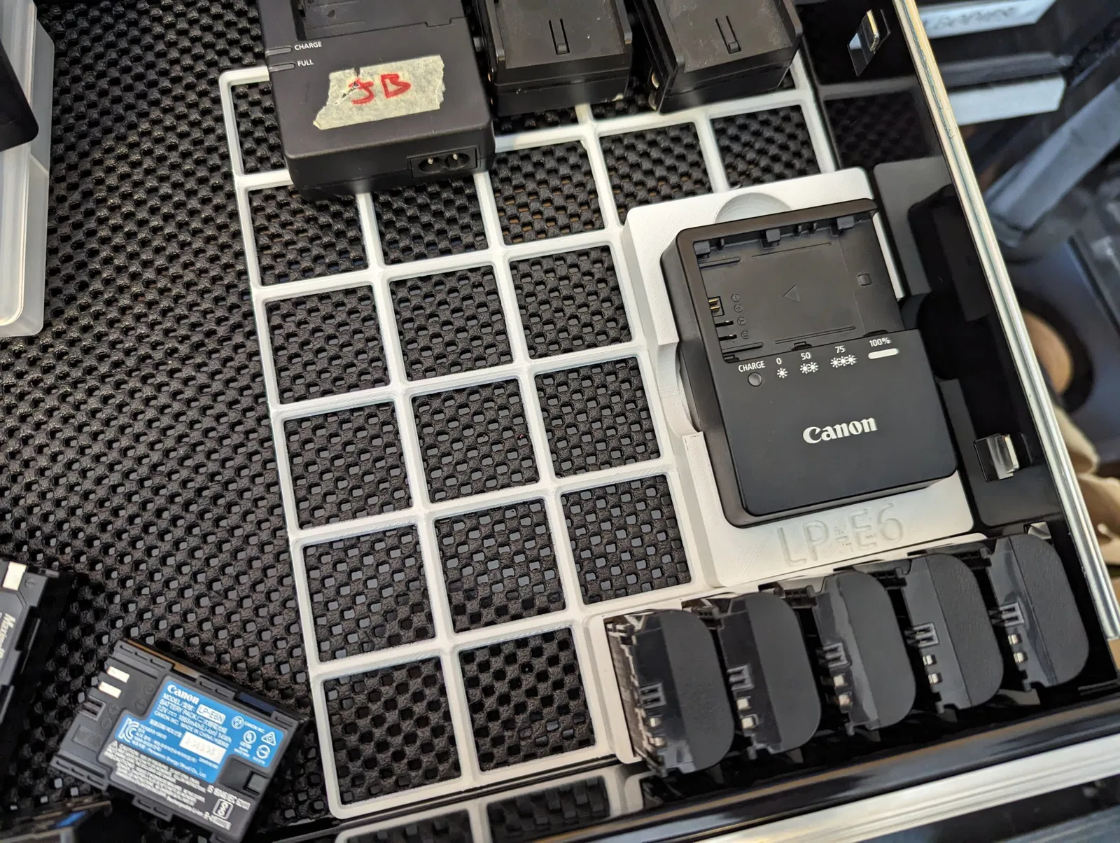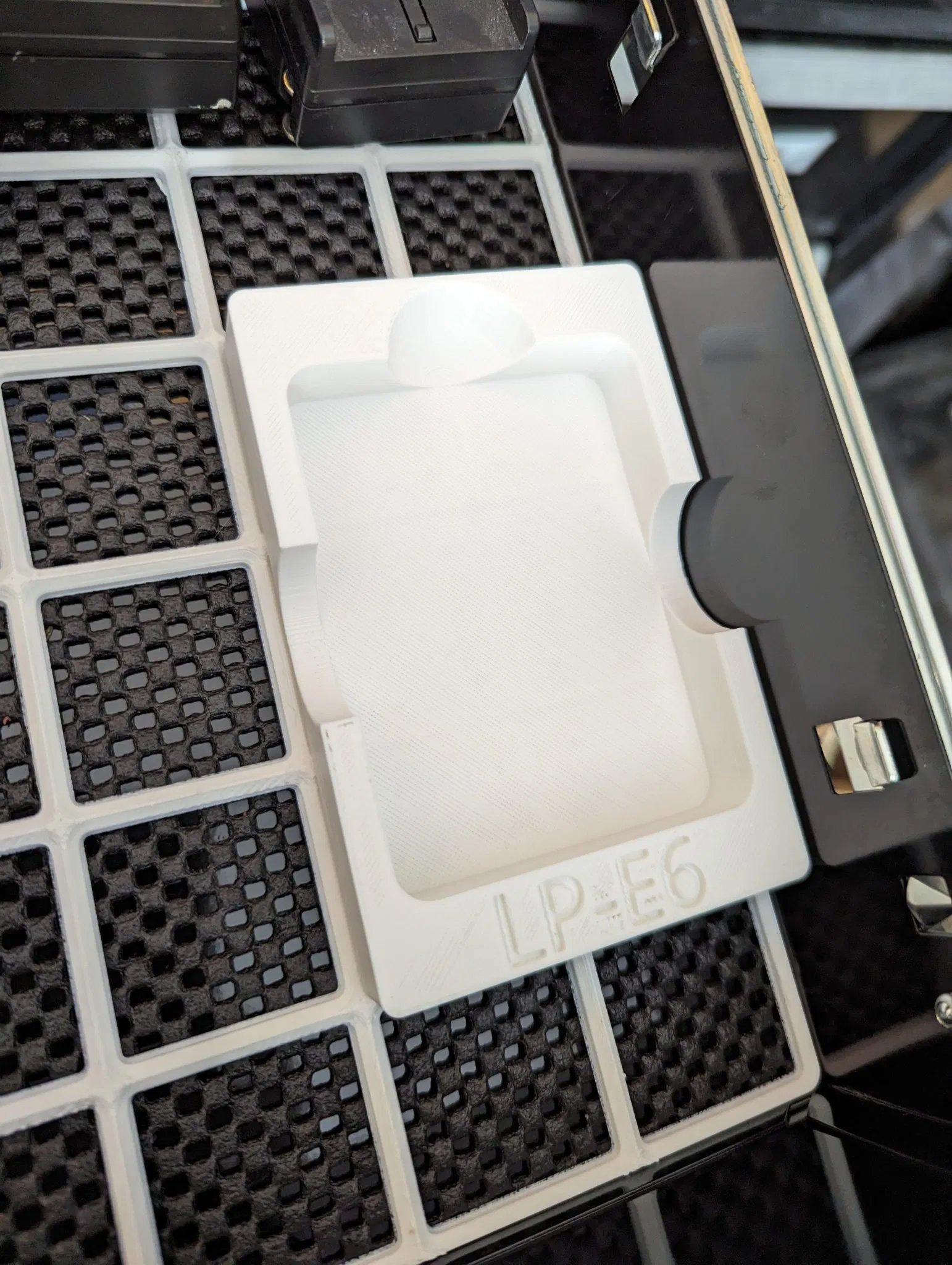 Một khay Gridfinity 2x3 tương thích với LC-E6. Mình cũng thêm chữ “LP-E6” bên dưới cục sạc để dễ nhận biết nó sạc loại pin gì.