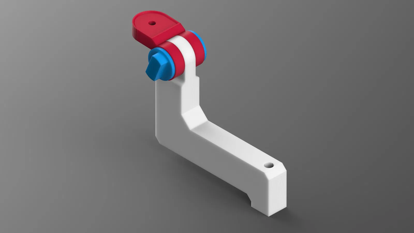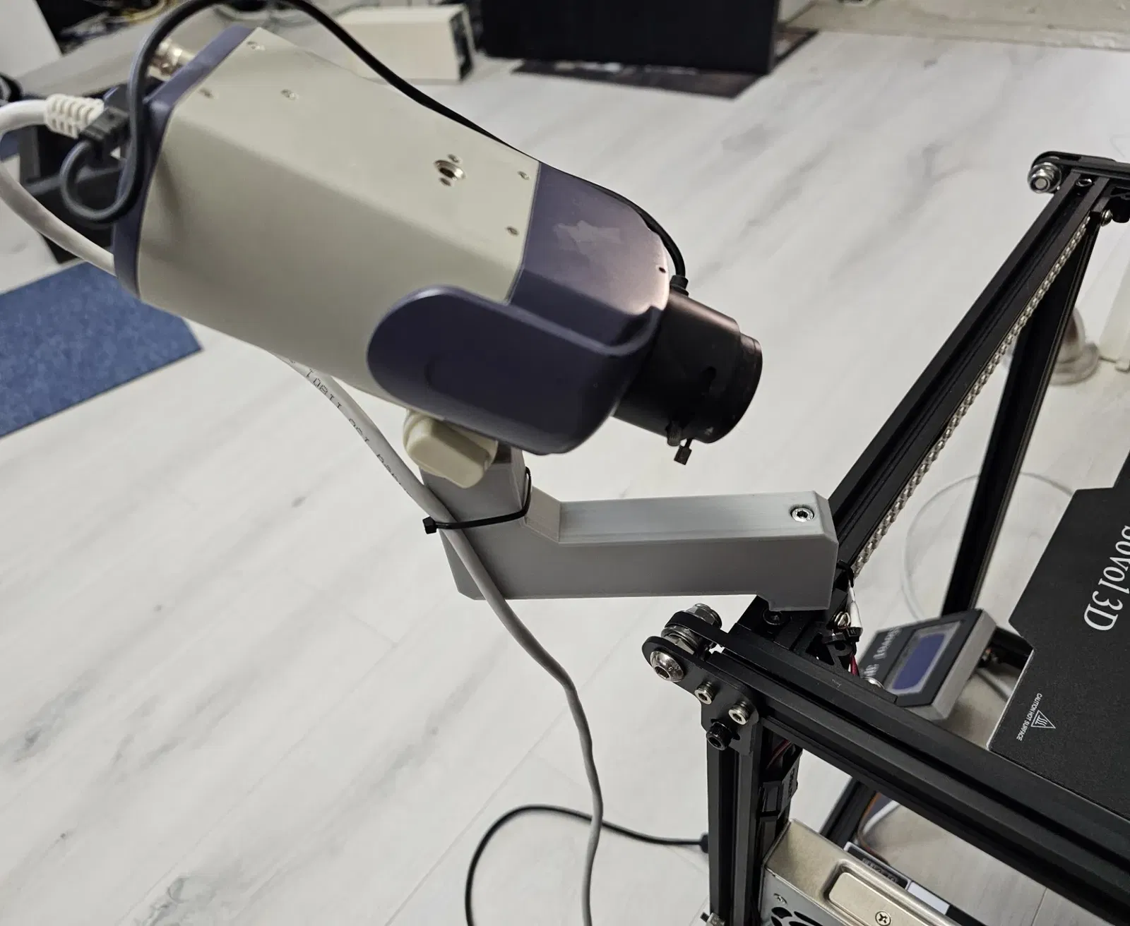 Tôi tạo cái tay đỡ này dựa trên một cái giá treo tường camera CCTV cũ mà tôi có sẵn. Nó được thiết kế để bắt vít vào thanh ngang phía trên của máy in cube với ốc M4 và đai ốc búa.