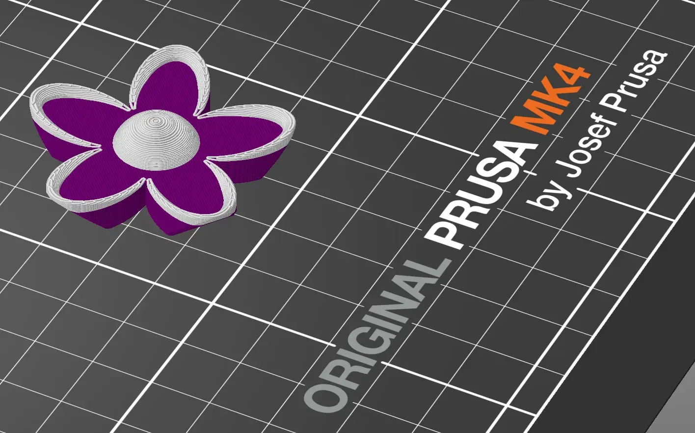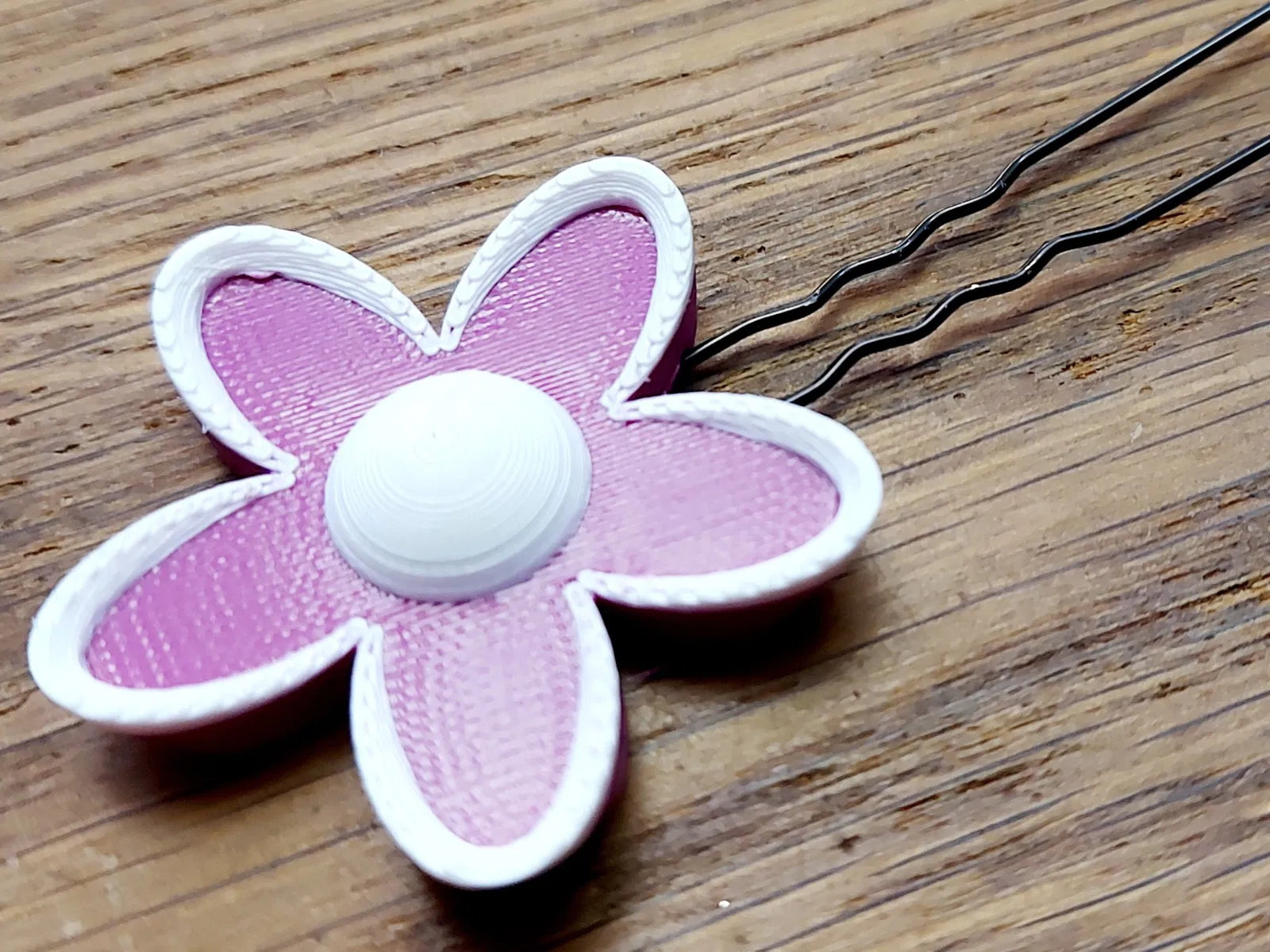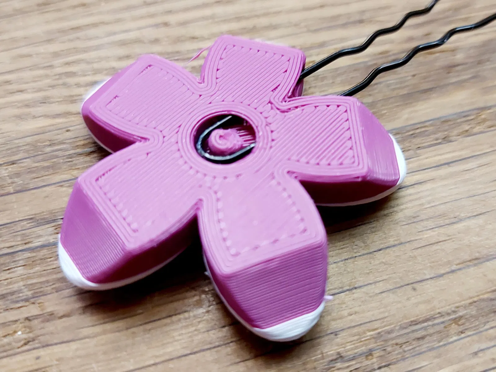 Cái kẹp tóc này hay lắm nè, in được hai màu mà chỉ cần đổi dây tóc có một lần thôi đó. Nó là hình bông hoa xinh xắn, làm bằng nhựa PLA, bạn có thể tải file STL về in liền nha.