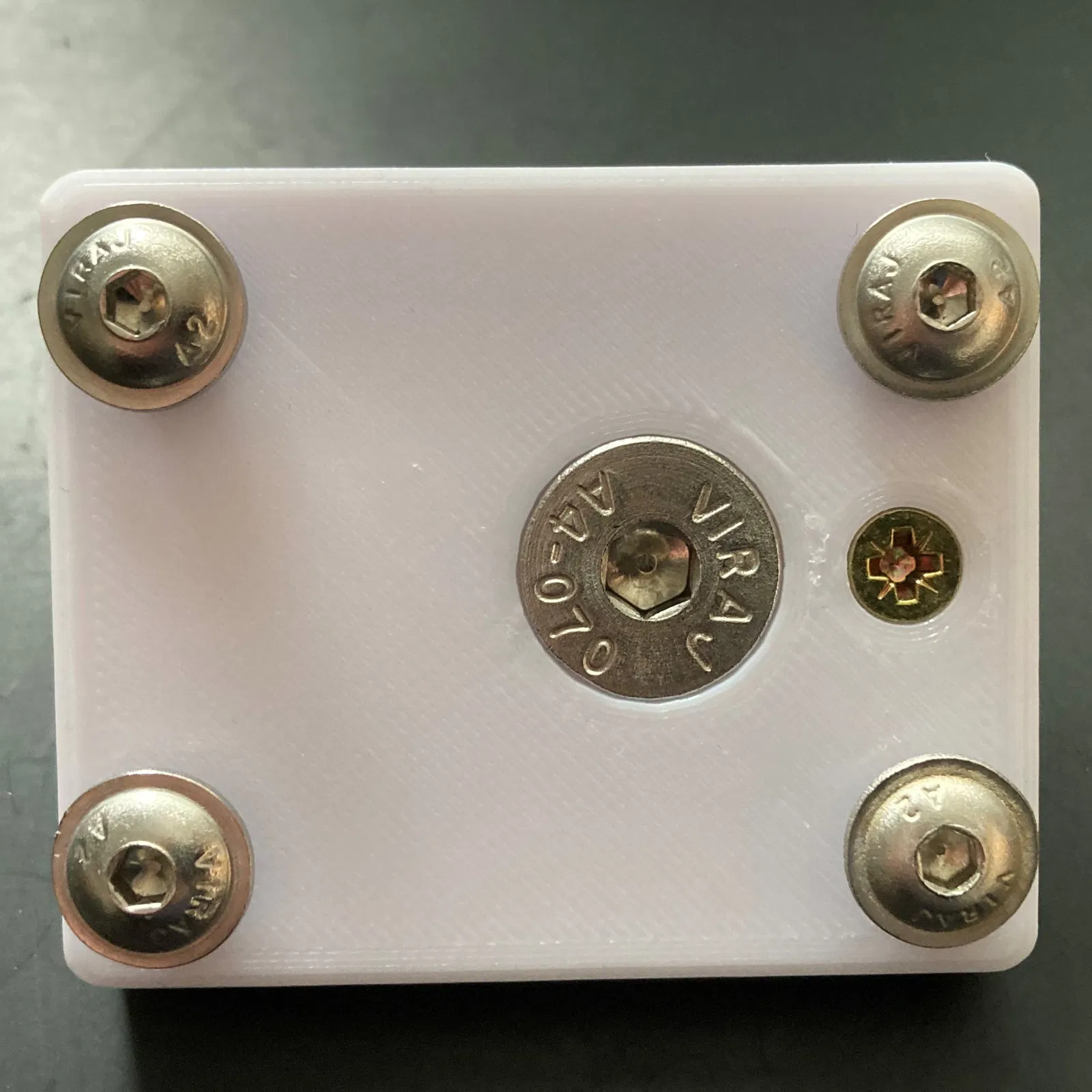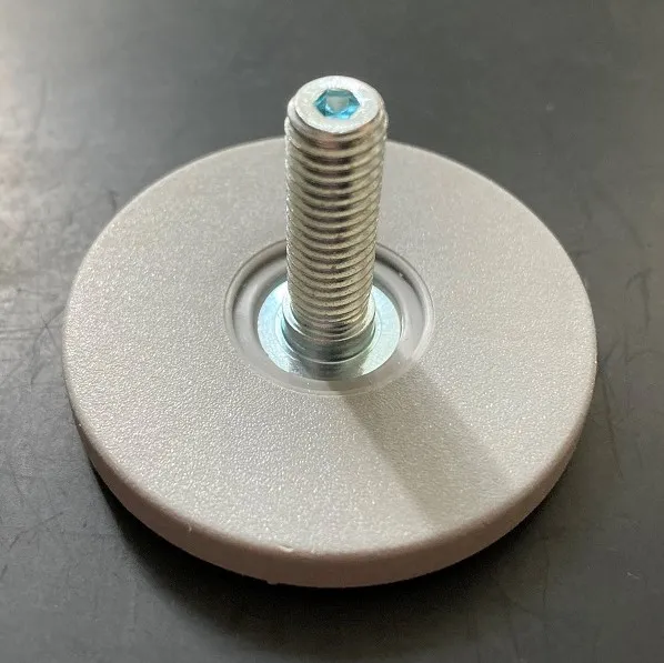 Thay vào đó, đế chuyển đổi được gắn vào tủ bằng một con vít M8 bắt chìm, tận dụng các lỗ ren có sẵn trên tủ, ban đầu dùng để bắt ốc chân tủ điều chỉnh độ cao (xem hình). Khi dùng đế chuyển đổi, dĩ nhiên là bạn sẽ mất đi khả năng chỉnh độ cao của chân tủ.