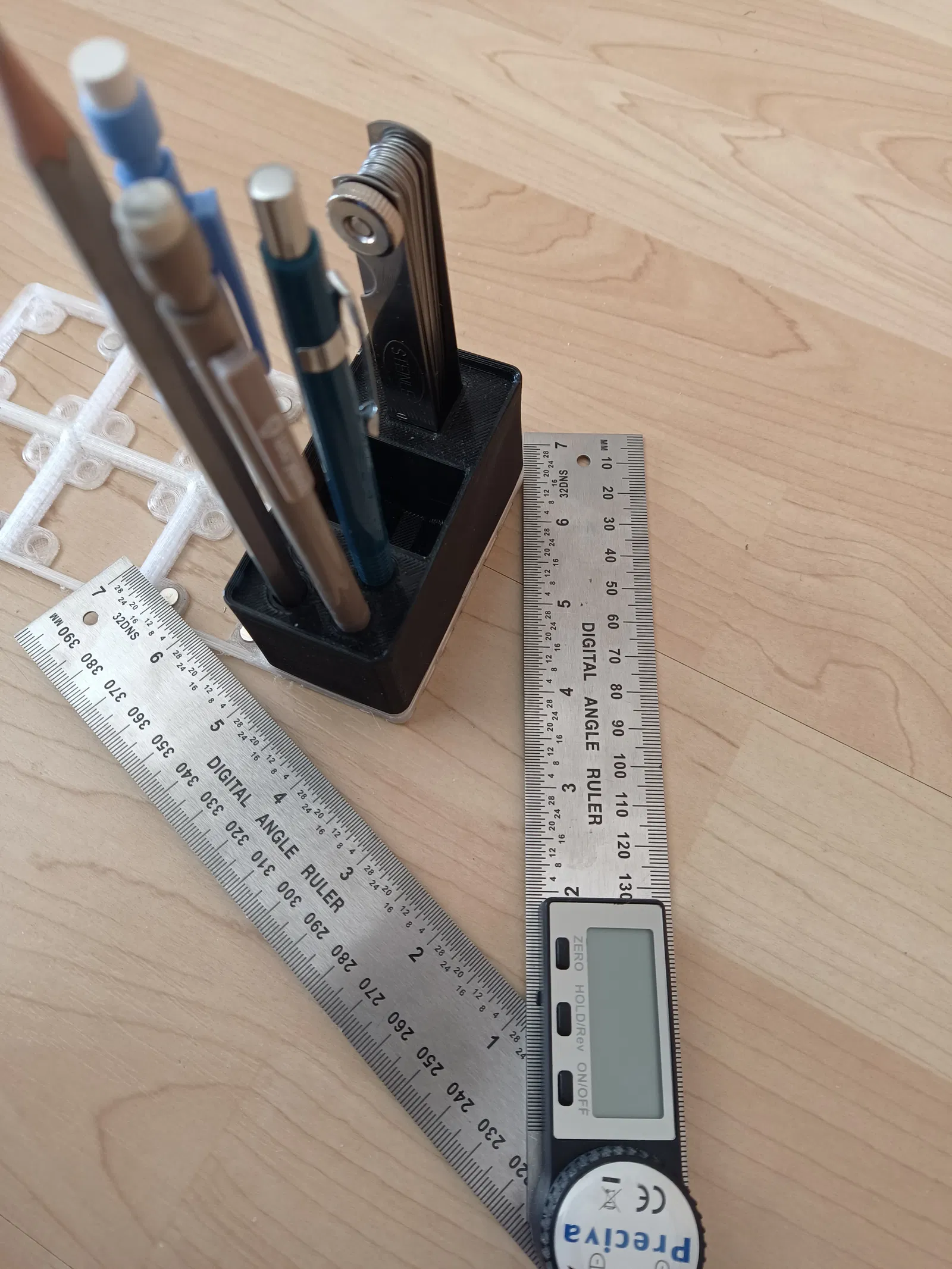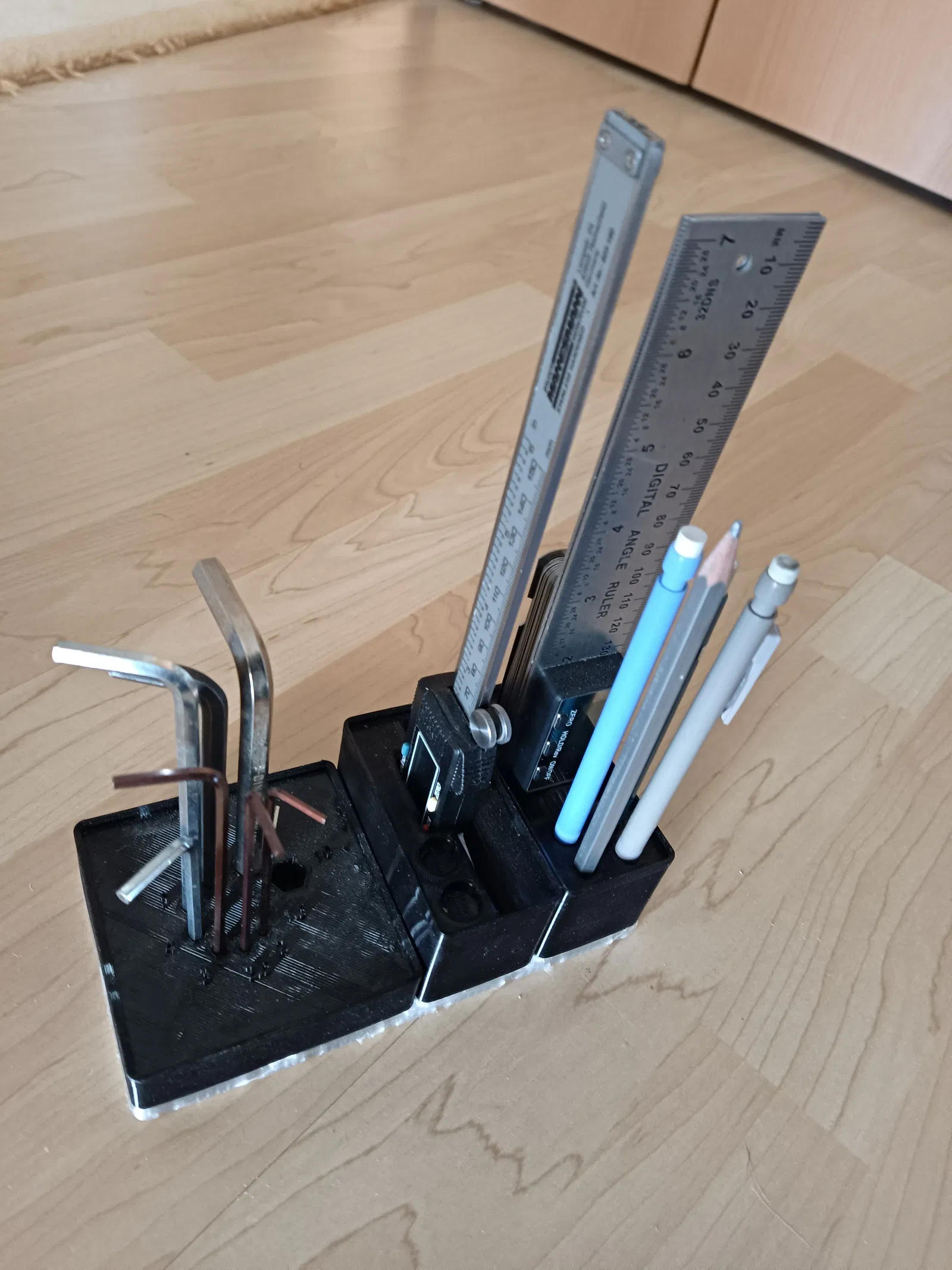 Đây là một cái holder dành cho hệ thống gridfinity để chứa một kẹp góc, một thước đo độ dày và 4 cây bút chì. Kích thước gridfinity là 1 x 2.