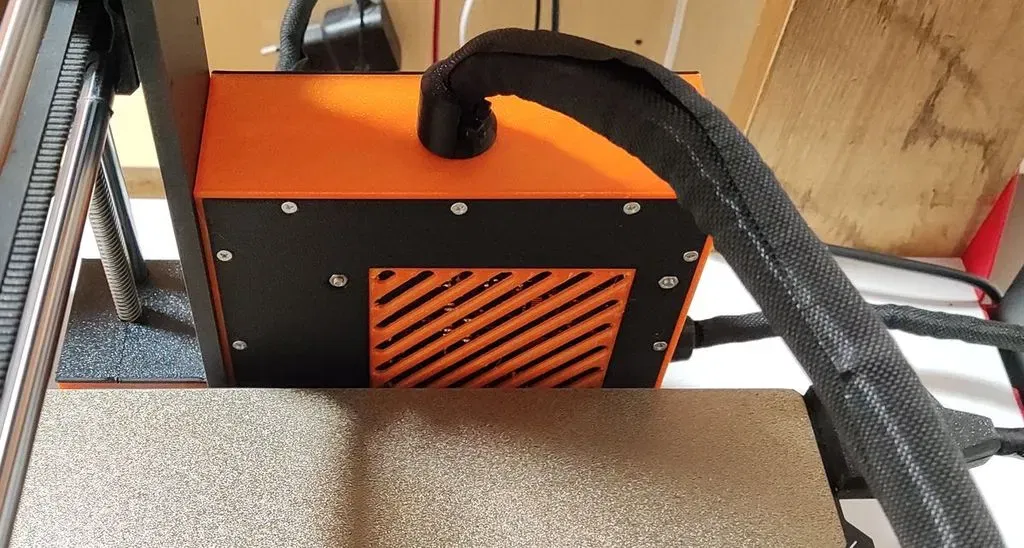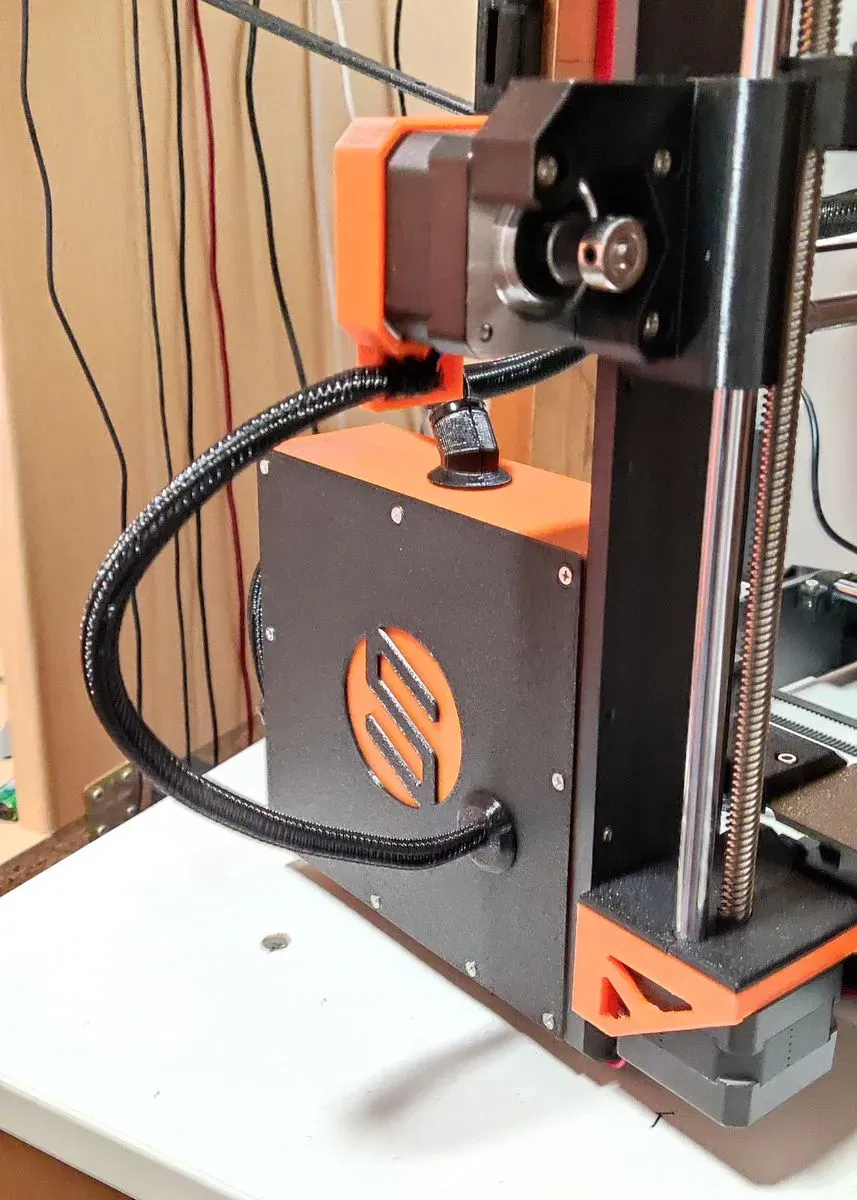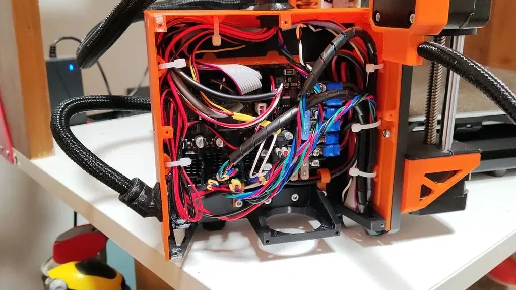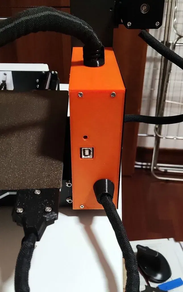 Cái hộp zin tui hok thíc lắm, mở ngay mặt bàn in, lại chật chội nữa, nên tui tự chế lại phiên bản của mình, mở ở hướng ngược lại, ra vô dễ dàng, lại rộng rãi nữa. Tui còn gắn thêm quạt phụ để làm mát nữa, nguồn điện thì tui lấy từ cục adapter đó. Tui bổ sung thêm mấy cái đế giữ dây cáp.