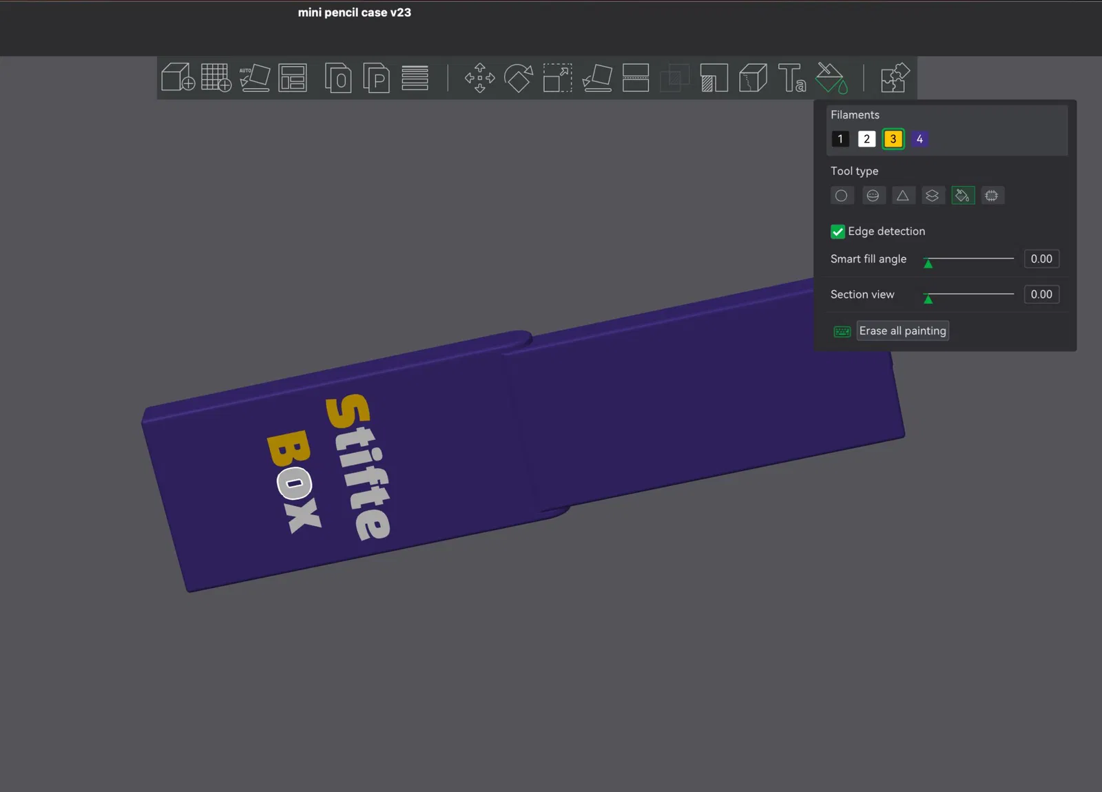 In ở độ dày 0,2mm phẳng trên bề mặt. Nếu bạn muốn in nhiều màu, chỉ cần tô màu bằng tính năng tô màu của BambuStudio, văn bản (tiếng Đức) được đùn với độ dày 0,01mm nên sẽ không có sự khác biệt nếu bạn không tô màu.