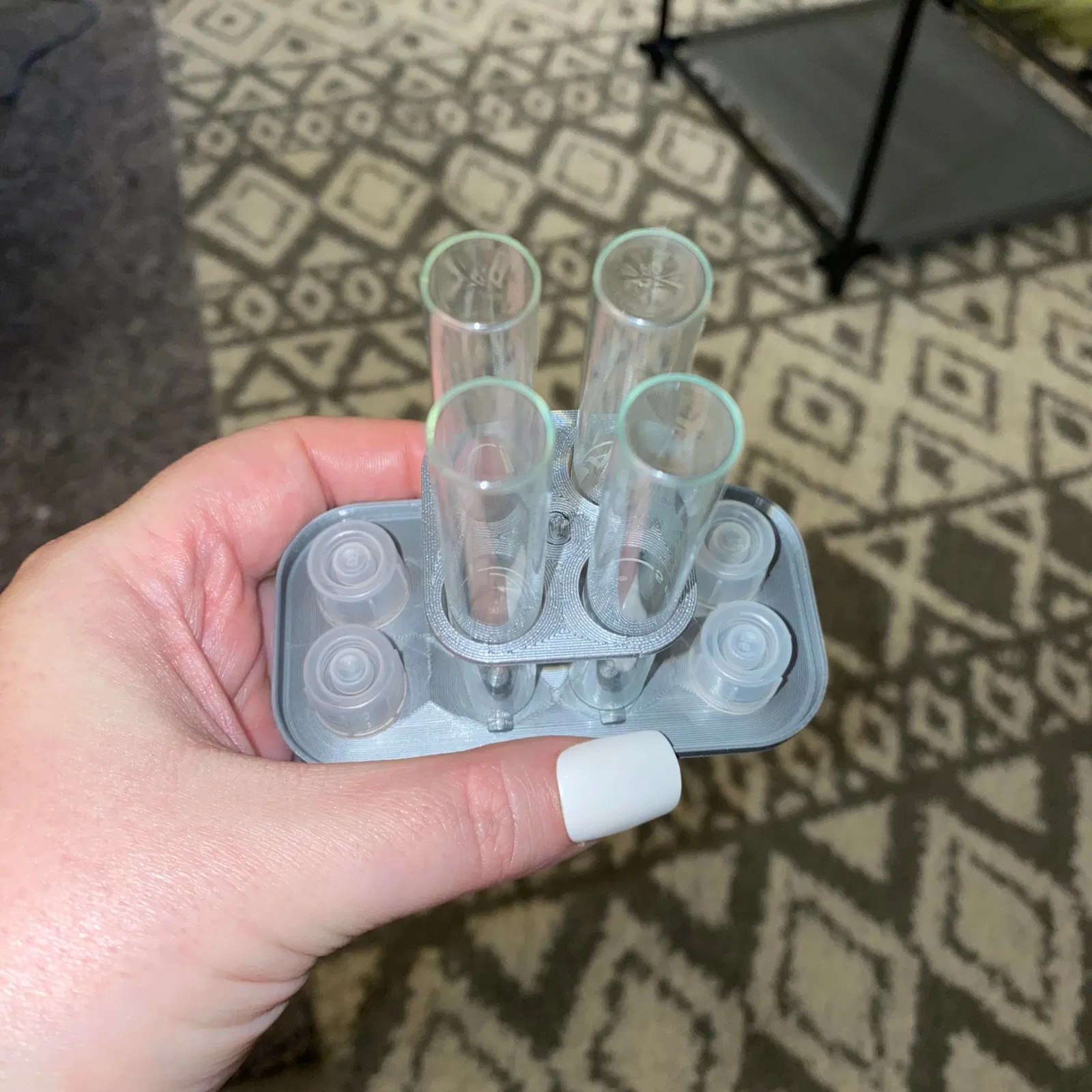 Đây là một cái đế nhỏ mình làm ra để giữ cho ống nghiệm và nắp của bộ API Master Test Kit úp ngược xuống để chúng có thể khô một cách thích hợp. In bằng PETG. Mình khuyên bạn nên ép phần trên vào trụ rồi nhỏ một giọt keo siêu dính để cố định chúng.