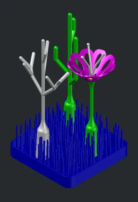 Giá phơi Boon phiên bản thu nhỏ, chỉ 2.5 inch vuông, đặt gọn gàng trên mặt bếp. Đi kèm đế cỏ 6 inch vuông và các phụ kiện giữ đồ như xương rồng, hoa. Lưu ý độ bám dính mặt bàn tốt khi in phụ kiện cao.