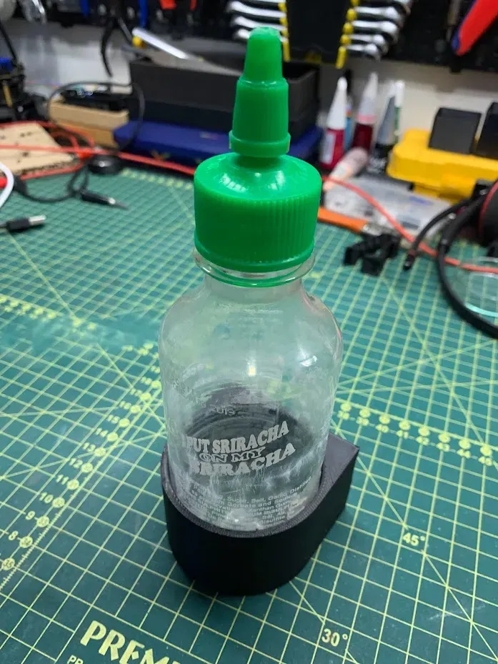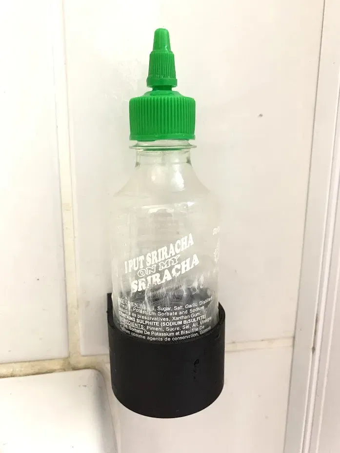In cái này dễ lắm, không cần support gì hết, có thể dùng để treo chai lọ lên tường để giải phóng không gian nè. Cái này được thiết kế đặc biệt cho chai Sriracha Sauce loại nhỏ (57mm) nhưng bạn có thể scale cho các kích cỡ khác nha.