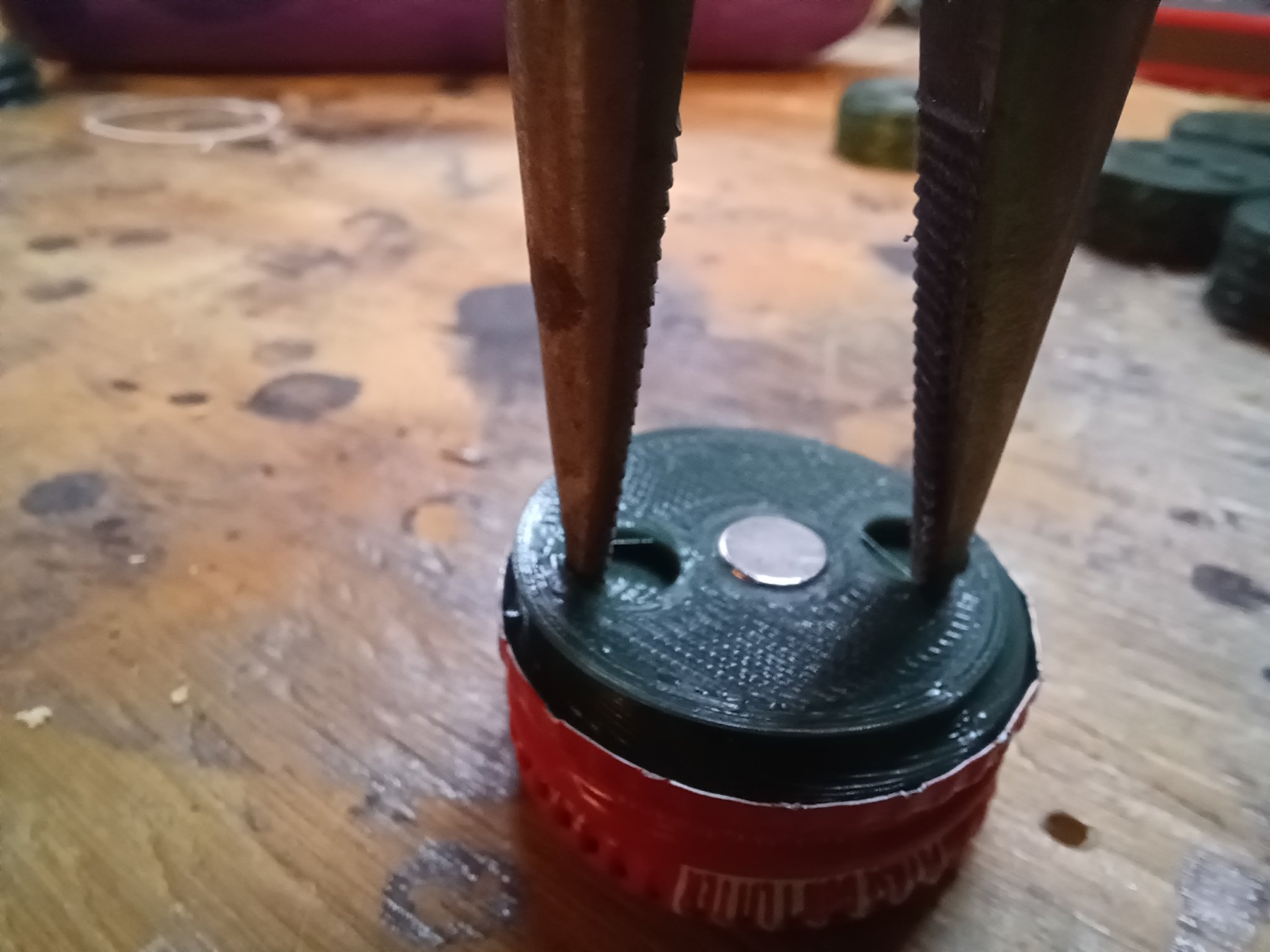 Có 3 lỗ để bạn gắn thêm nam châm nếu muốn, tuy nhiên tui chỉ dùng 1 cục nam châm ở lỗ giữa thôi. Tui dùng kèm kềm mũi nhọn ở hai lỗ ngoài để siết chặt cái đế vô nắp lon cho nó thiệt chắc ăn nha (coi hình số 7).