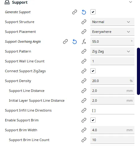 In bằng PLA, độ đặc ruột 10% và có support (coi hình số 9 để biết cài đặt support trên Cura). Nếu in support khéo léo, bạn có thể gỡ nó ra dễ dàng để có bản in hoàn hảo (coi hình số 2 & 3).