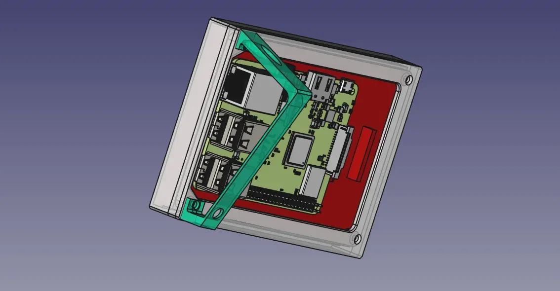 Khung đơn giản, ngoài ra còn có một giá đỡ bao gồm hai phần giống hệt nhau, hiện tại khá đơn giản. Giá đỡ được thiết kế để làm cho màn hình (với một Raspberry Pi gắn kèm) vừa vặn ở phía trước của Prusa i3 MK3 (55mm ở điểm cao nhất của khung).