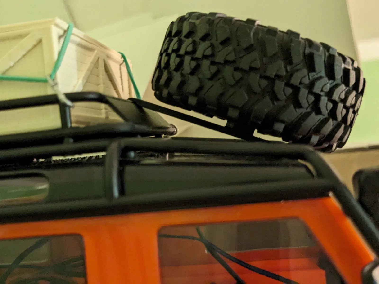 Một cái giá đỡ bánh sơ cua đơn giản gắn trên nóc xe Defender TRX-4M. Thiết kế này giúp phân bổ lại trọng lượng xe, đưa thêm trọng lượng lên phía trước, thay vì để bánh sơ cua ở phía sau. Gắn vào khung xe dễ dàng.