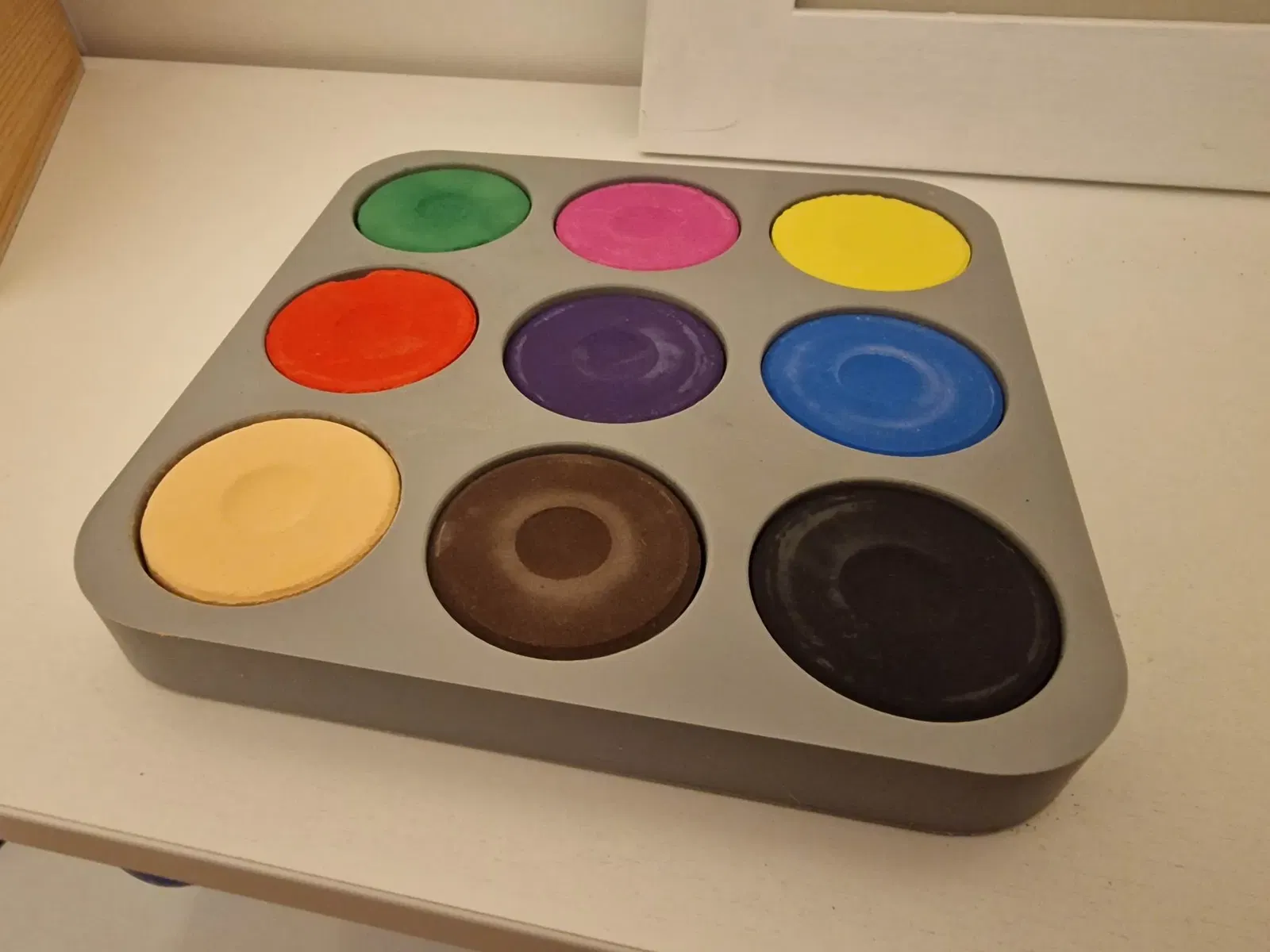 Khay màu nước được thiết kế cho các viên puck 55mm, có hai phiên bản: đầy đủ và vỏ rỗng để tiết kiệm vật liệu. Hướng dẫn chi tiết về kích thước và cài đặt in được cung cấp để đảm bảo bản in thành công, đặc biệt lưu ý cho phiên bản vỏ rỗng.