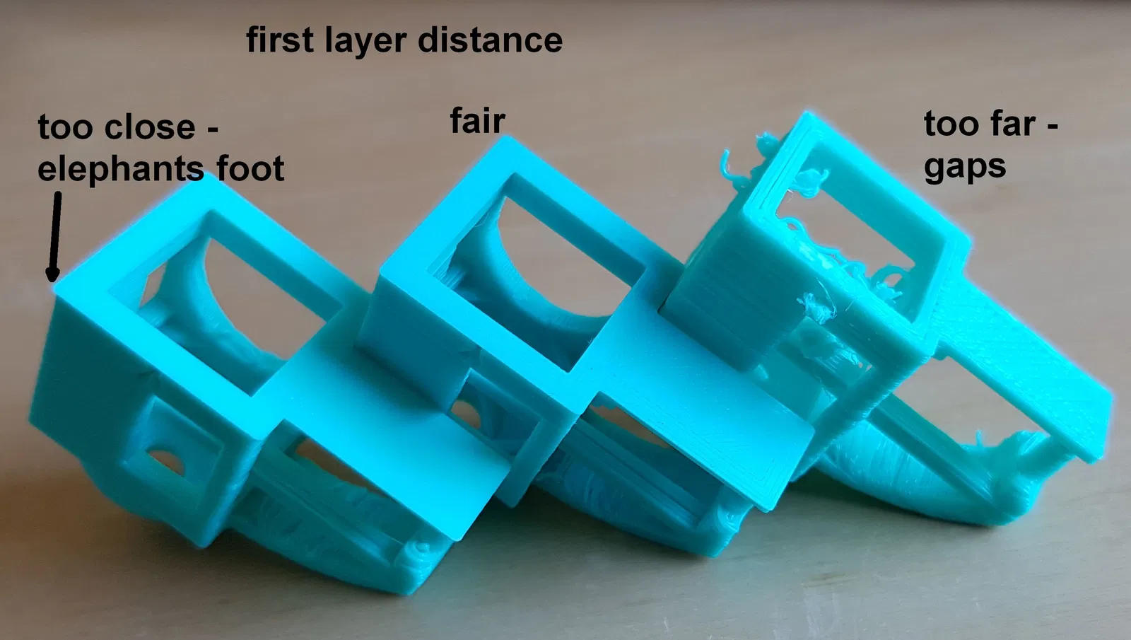 - “first layer distance” - Nếu đầu phun quá xa bàn in (bên phải), bạn sẽ có các khe hở và bản in có thể bị bong ra khỏi bàn. Nếu đầu phun quá gần (bên trái), filament sẽ bị ép sang hai bên, tạo ra “chân voi”. (Cá nhân tui thường thích có một chút chân voi để có bề mặt lớp đầu tiên và độ bám dính hoàn hảo, sau đó gọt bỏ nó đi.)