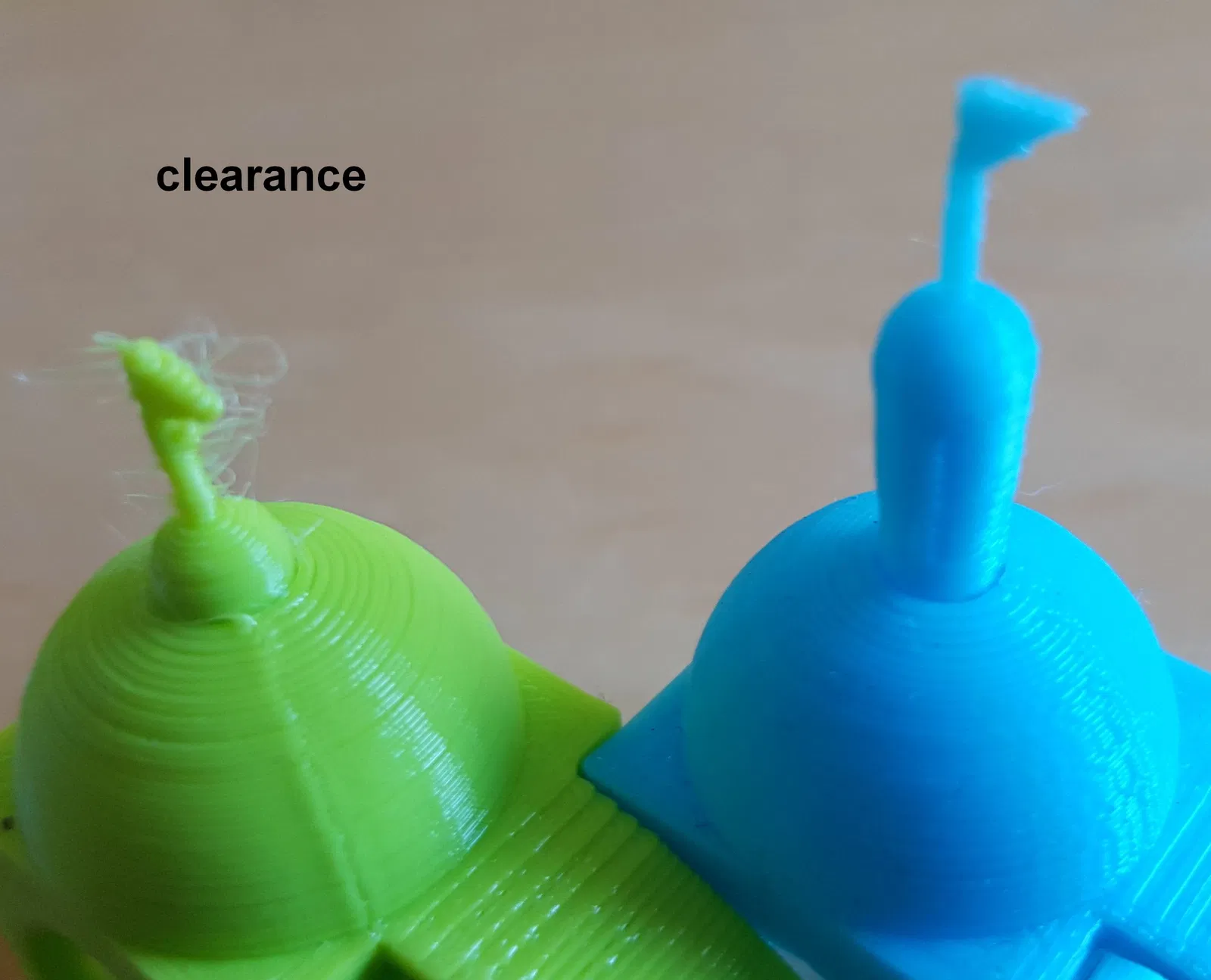 - “clearance” - Nếu lồng đèn vừa khít bên trong như ở bên trái, có độ hở bằng không - điều này không nên xảy ra vì bề mặt bị nhám và không thể khớp chính xác. Vì vậy, bạn có thể bị lỗi under-extrusion, hoặc filament co giãn như trong hình. Nếu nó chỉ vừa khít một chút, bề mặt mô hình (với độ nhám) nhô ra 0.4 mm (có thể do chân voi). Thông thường nó sẽ vào được một nửa. Có các vết lõm khác nhau ở hai bên lồng đèn để bạn có thể dùng làm thước đo mà không cần đo.