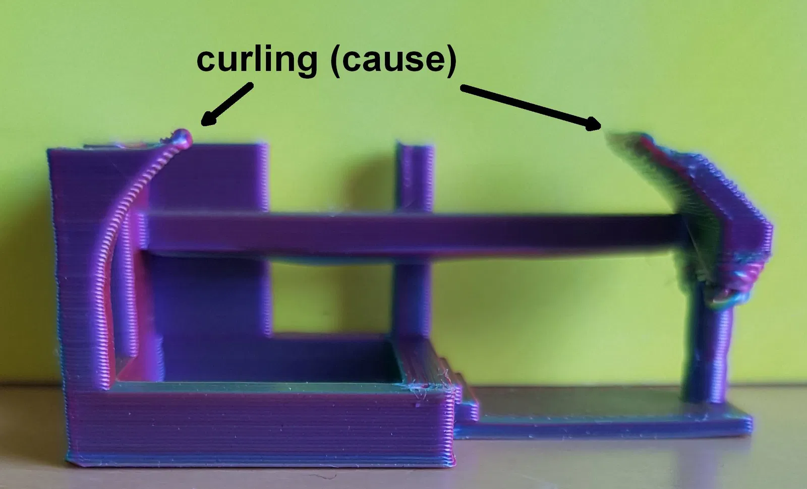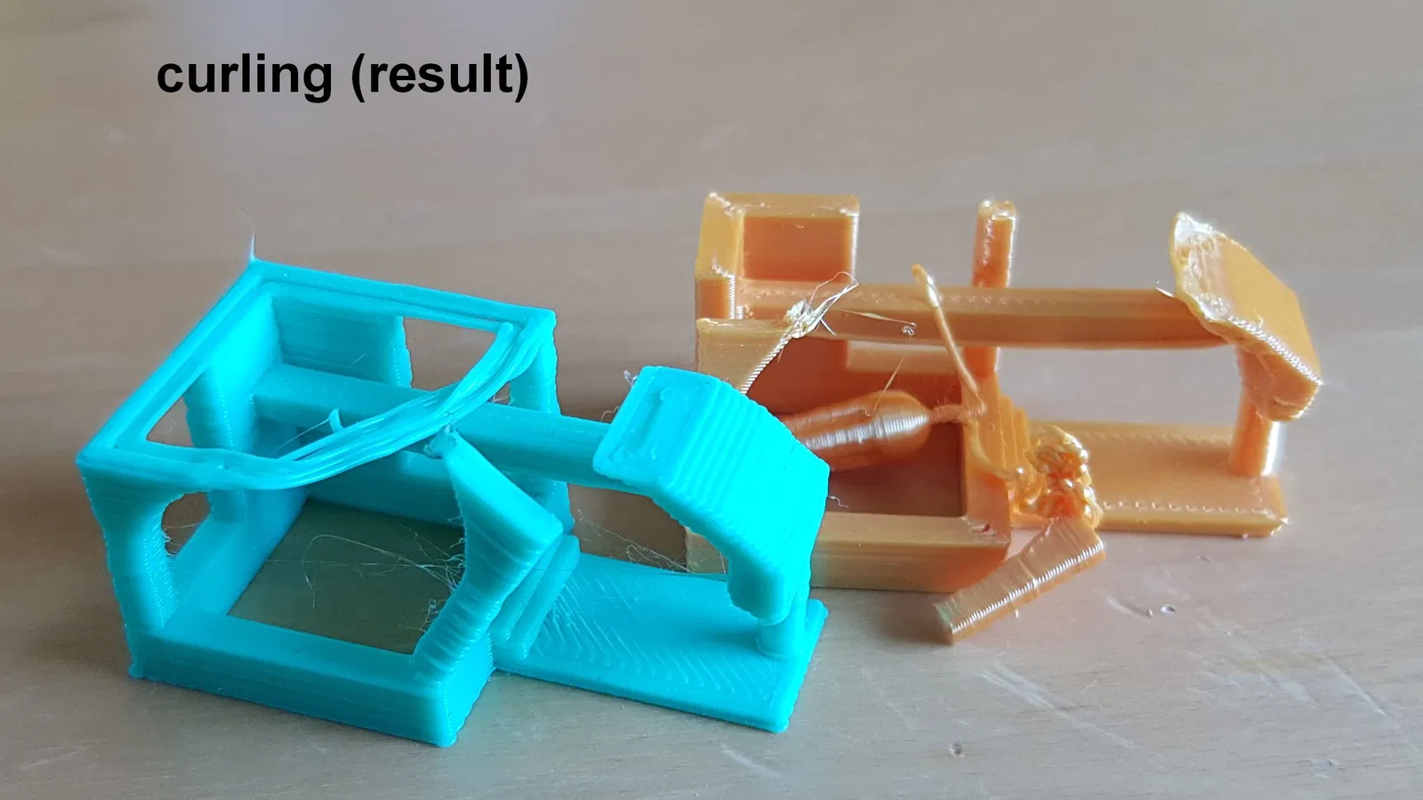 - “curling - cause” và “- effect”: Đây là hiện tượng các phần nhô ra bị cong lên trong quá trình làm mát. Đầu phun có thể va vào phần bị cong và làm gãy bộ phận hoặc làm nó bong ra khỏi bề mặt. Vấn đề rất phổ biến với bài kiểm tra này. Tui chưa tìm ra giải pháp chung.